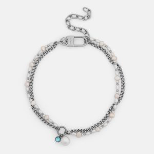 Materials: Synthetic Pearl. Crystal. Stainless Steel. 40cm (16) at its shortest. adjustable up to 50cm (20). Chain measures 5mm thick.