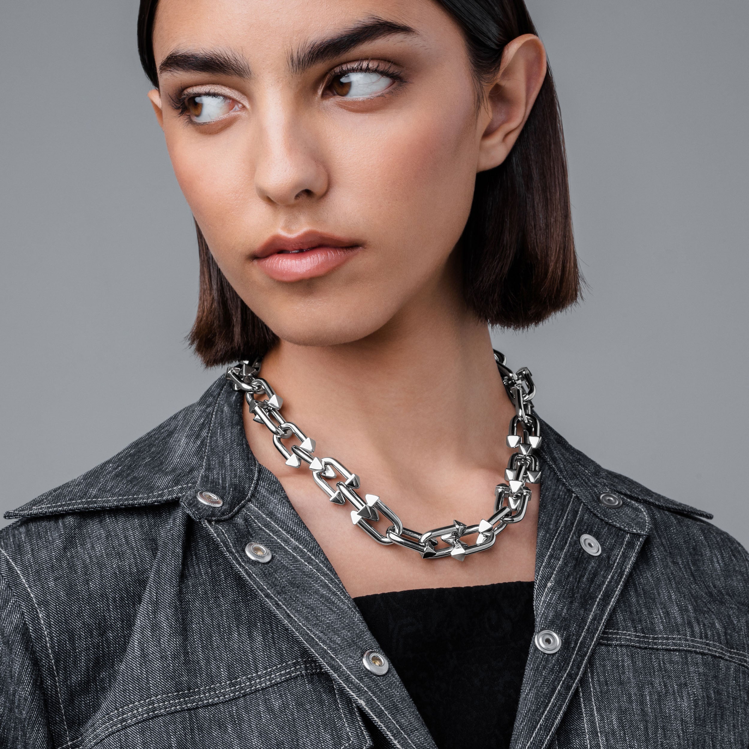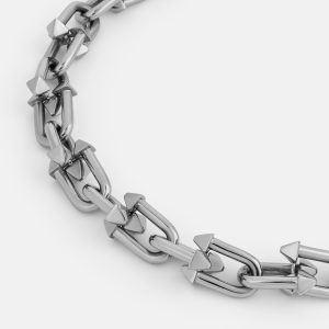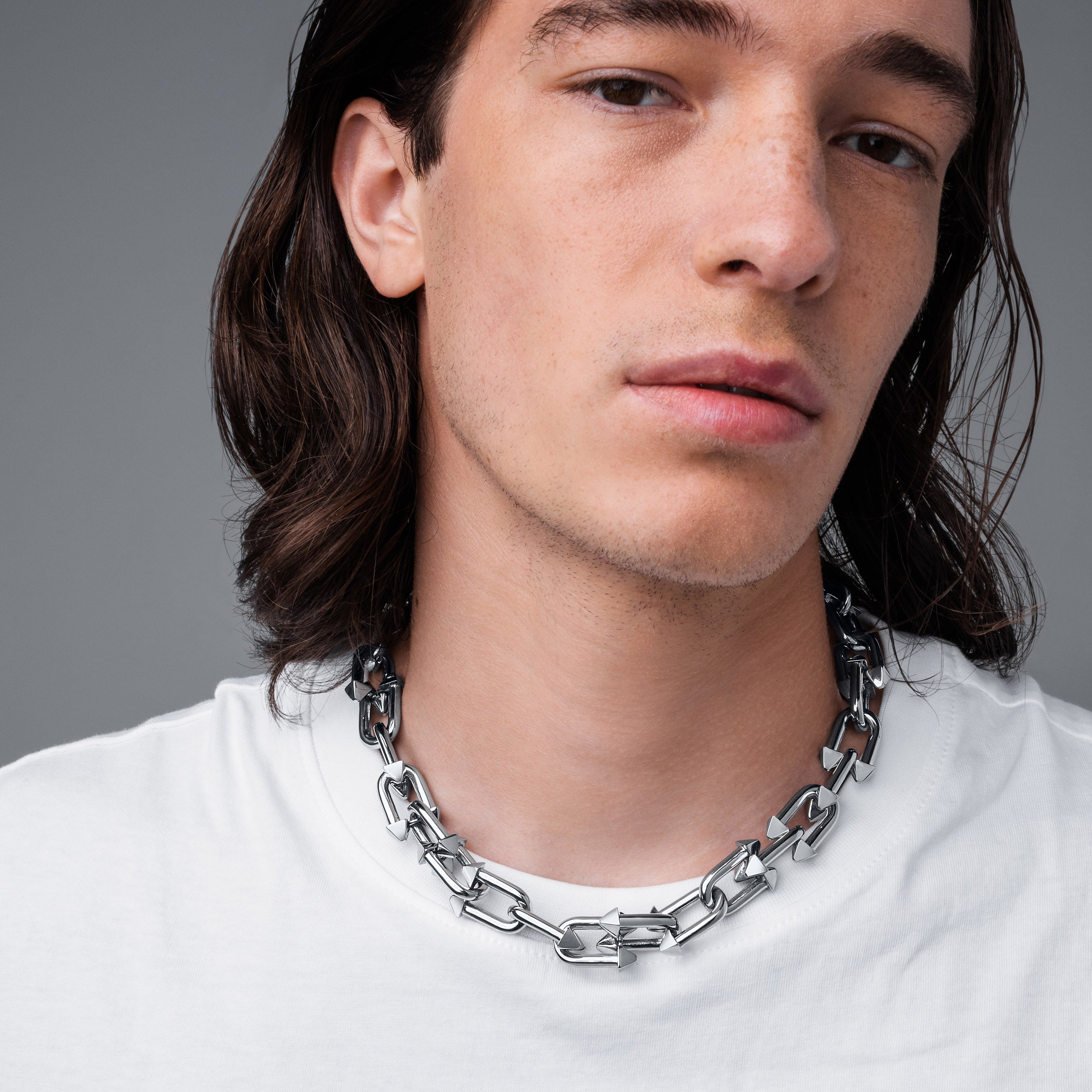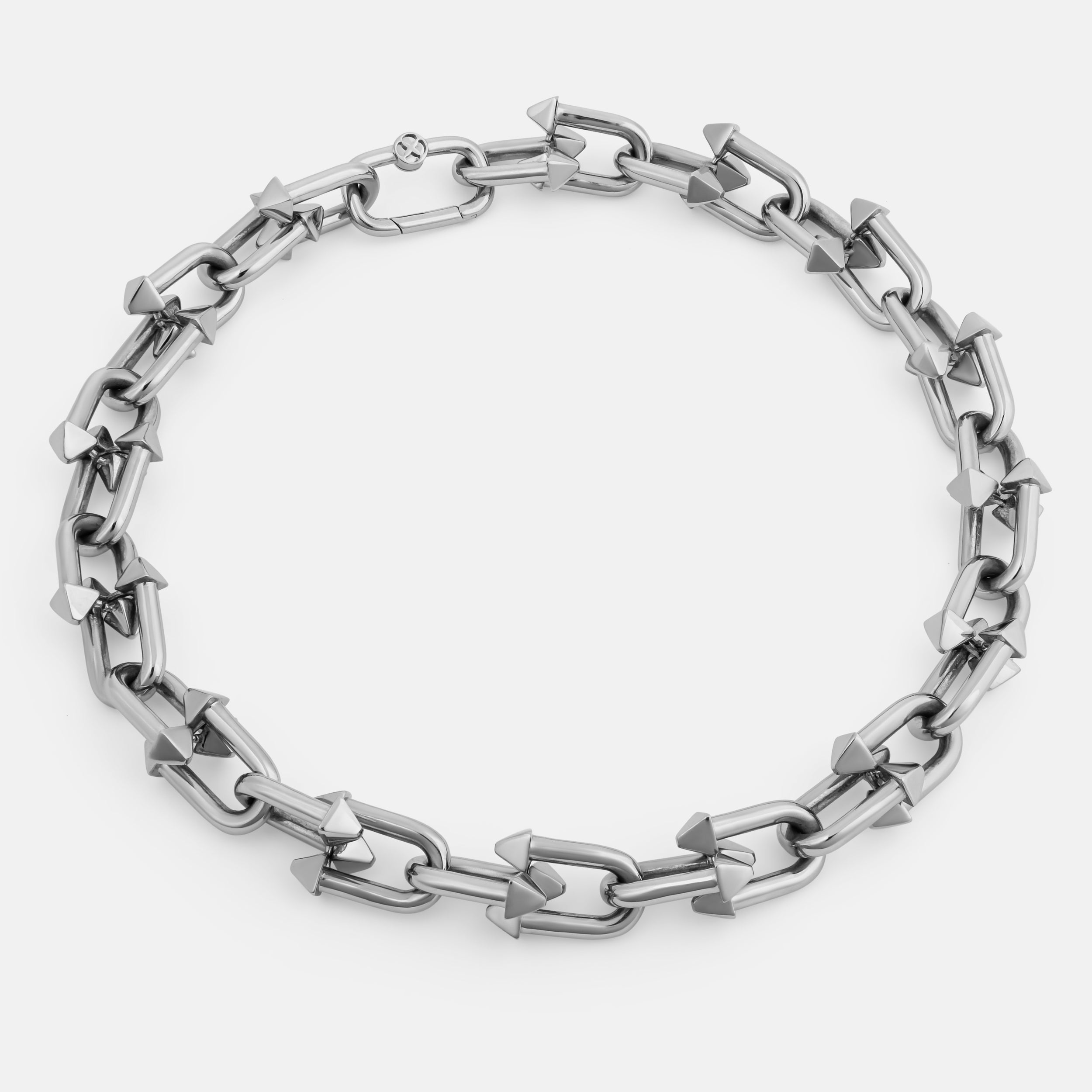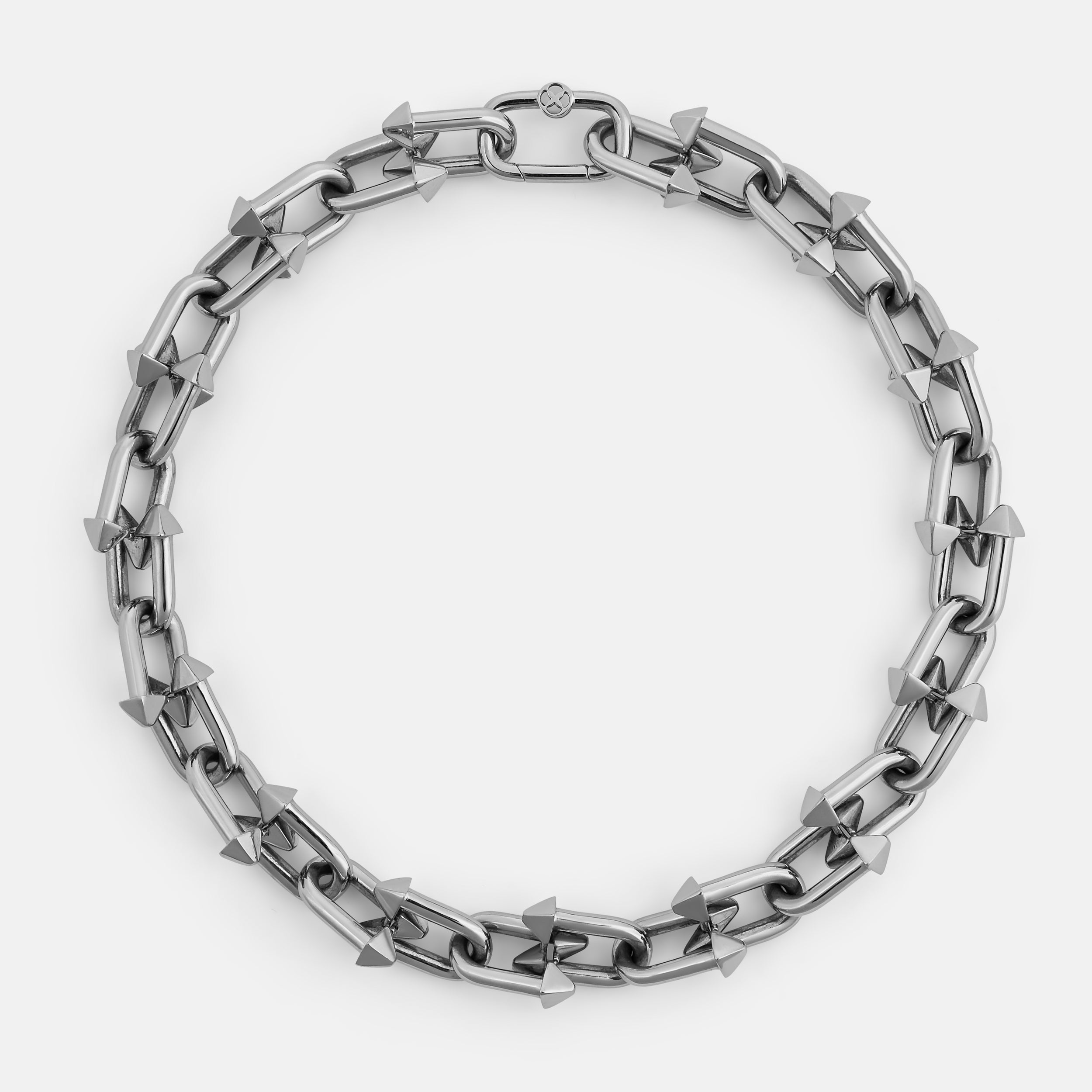 This mean-looking chain is constructed from heavy-duty interlocking links. each marked by dual spiked rivets. Designed to sit close to the collarbone. it comes finished with a custom carabiner and subtle Glyph branding.