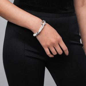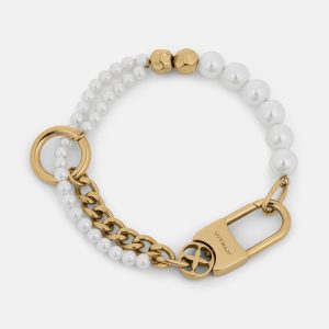 The Tide features strings of synthetic pearls that weave through an oversized jump ring and find balance against industrial steel detailing including geometric beads. sleek chainlink and our signature Glyph carabiner clasp.