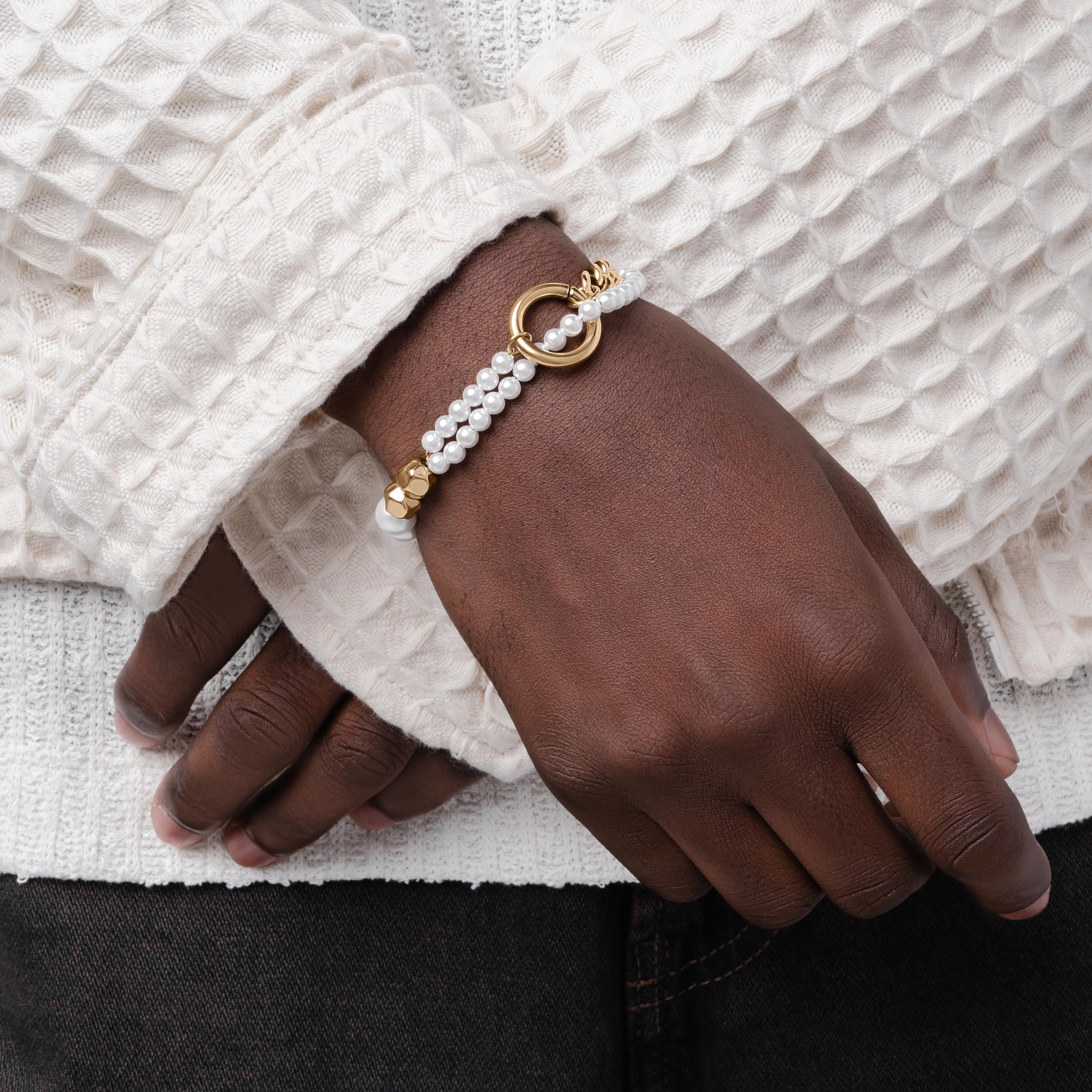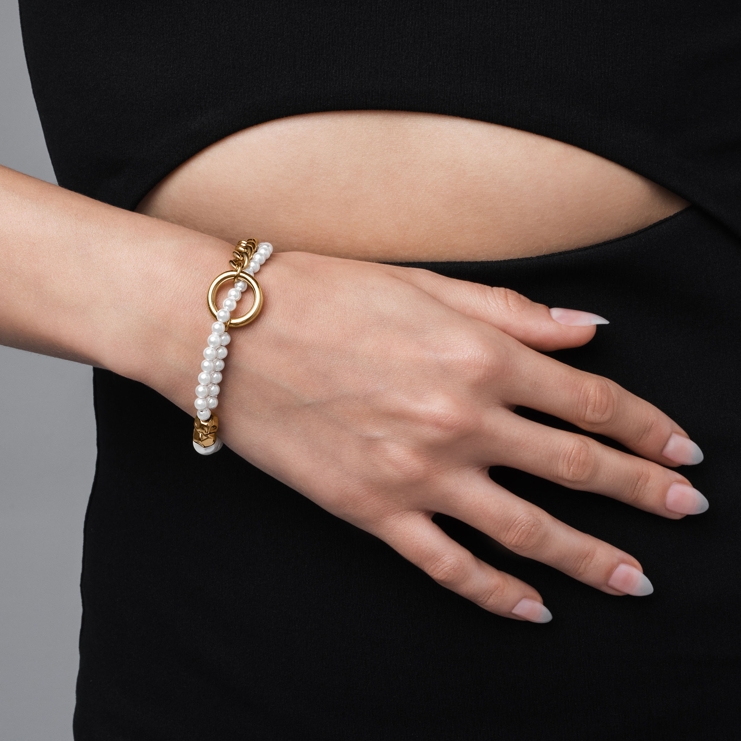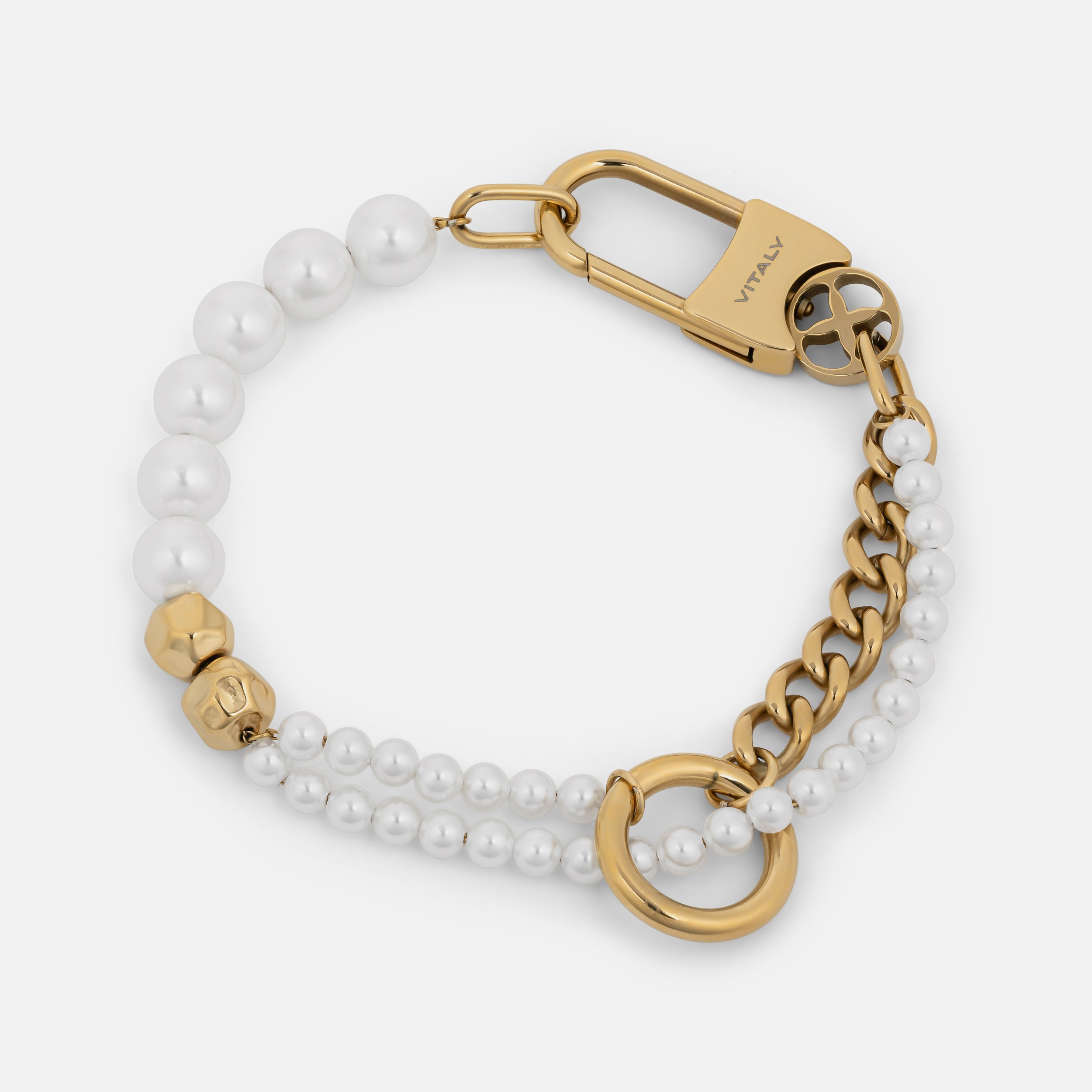 The Tide features strings of synthetic pearls that weave through an oversized jump ring and find balance against industrial steel detailing including geometric beads. sleek chainlink and our signature Glyph carabiner clasp.
