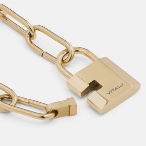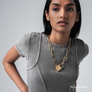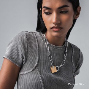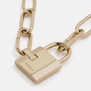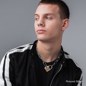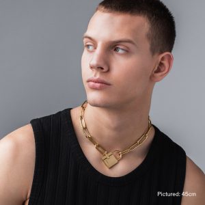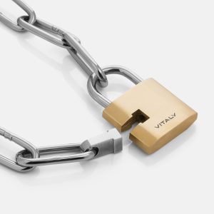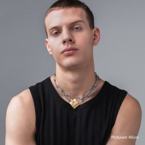 The Trespass features polished steel links with a custom brushed-gold padlock. The unique magnetic clasping mechanism causes the lock to hang asymmetrically. putting a new spin on a well-worn design.