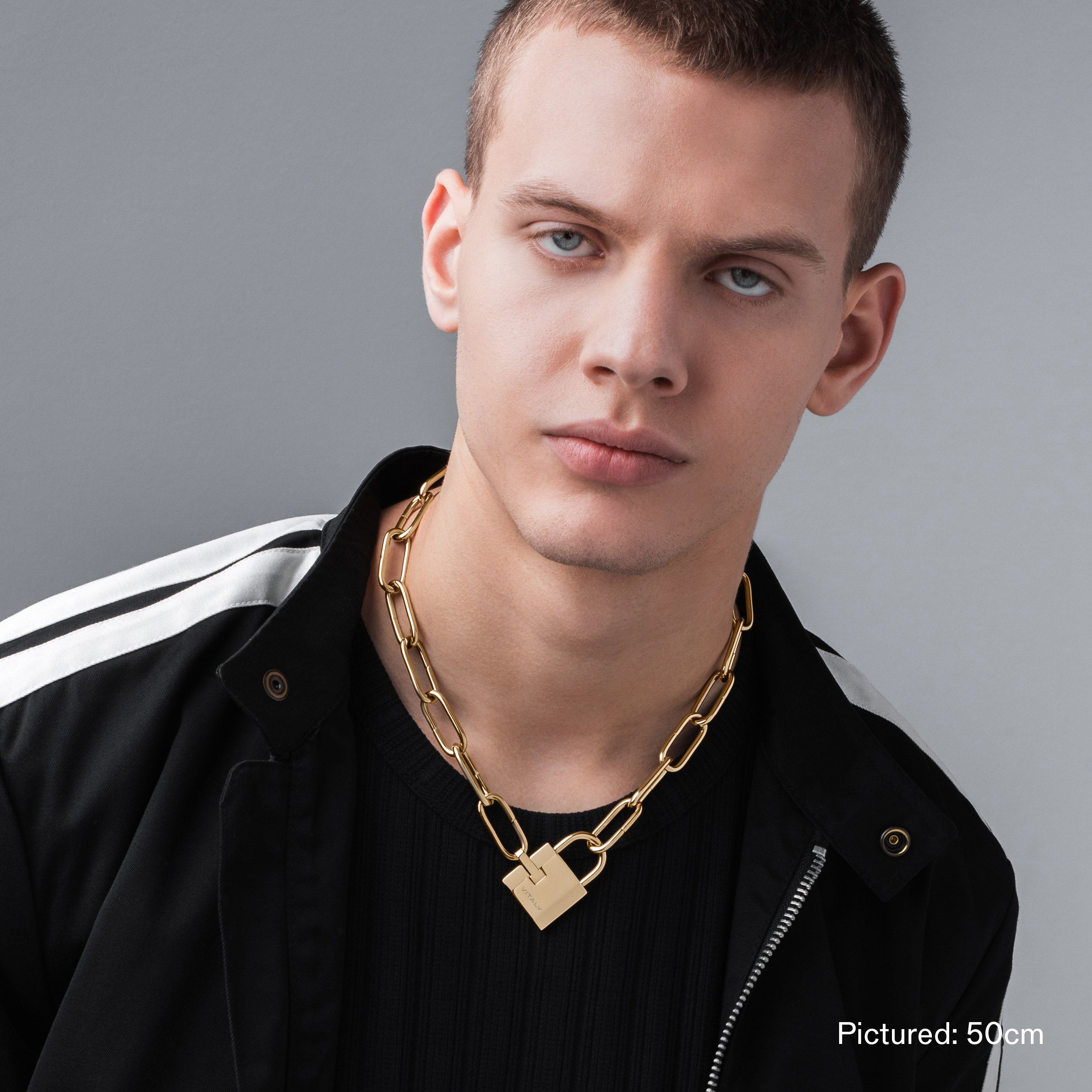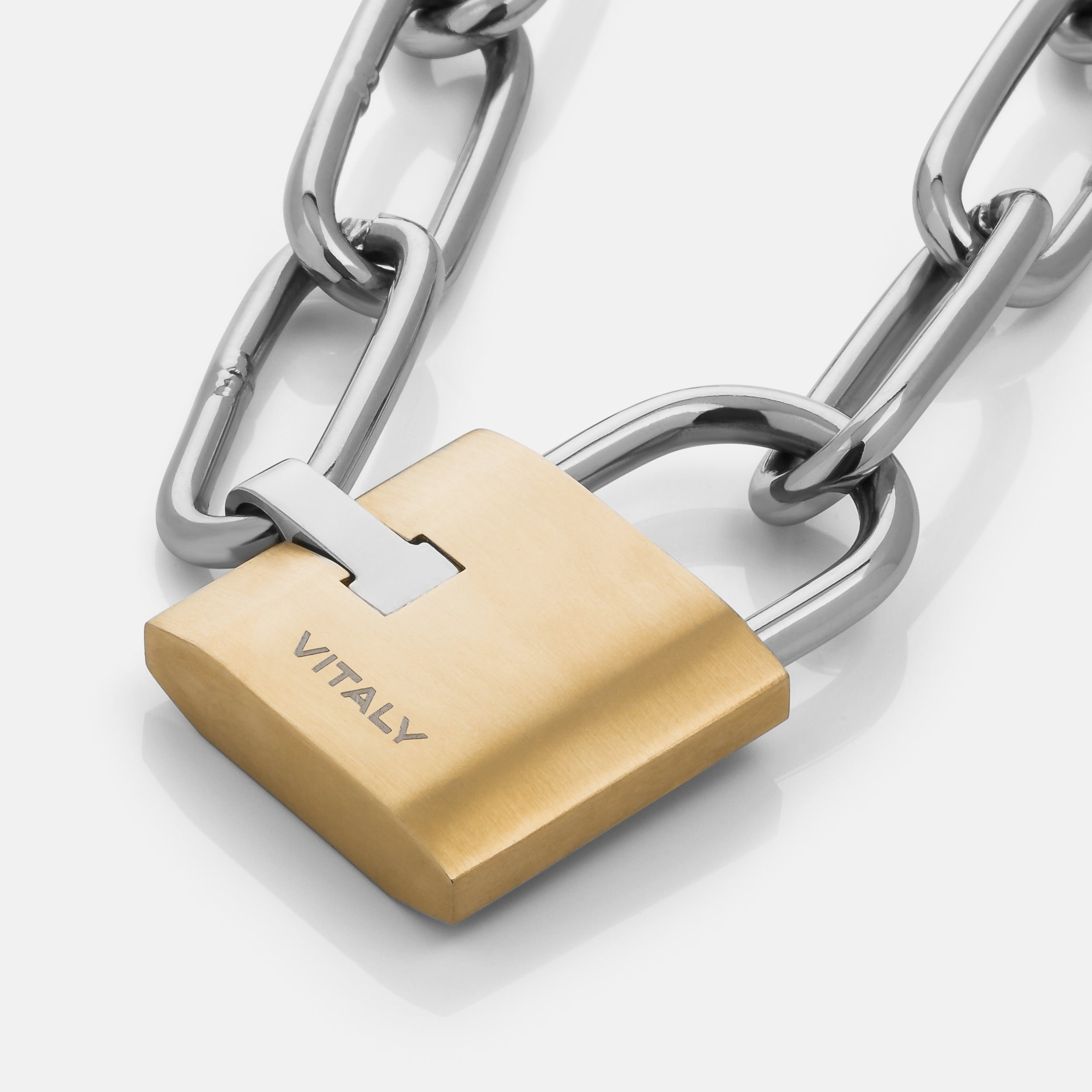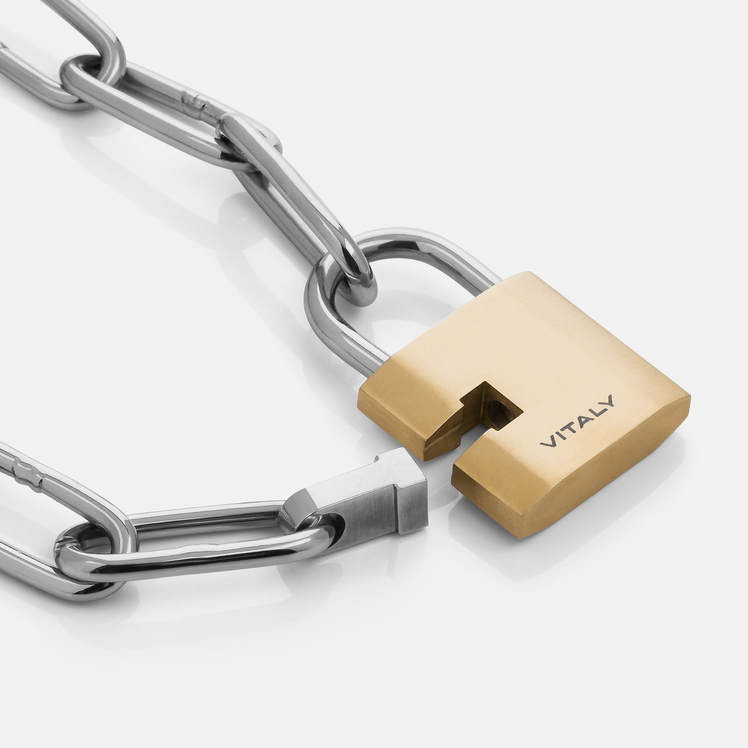 The Trespass features polished steel links with a custom brushed-gold padlock. The unique magnetic clasping mechanism causes the lock to hang asymmetrically. putting a new spin on a well-worn design.
