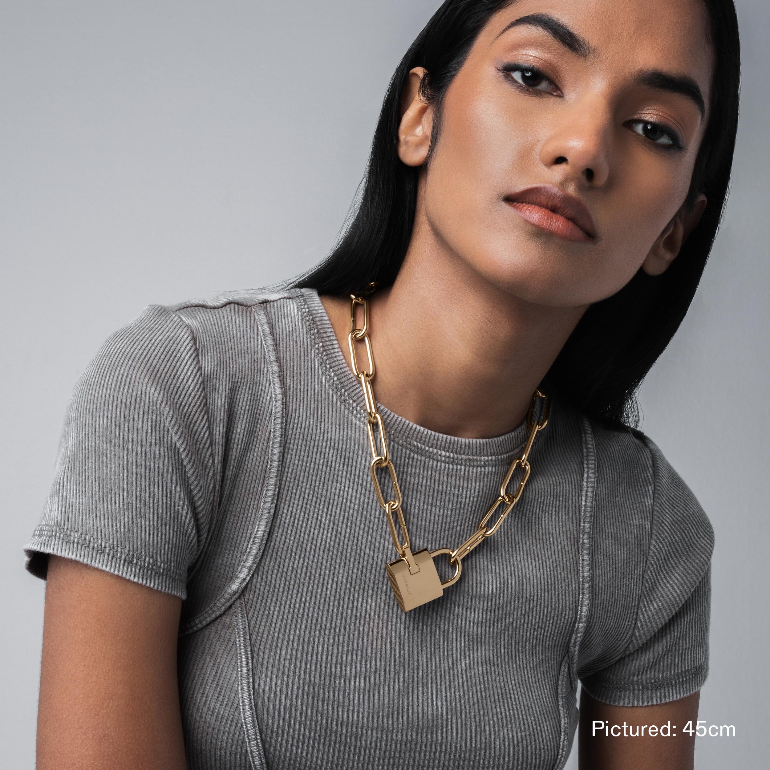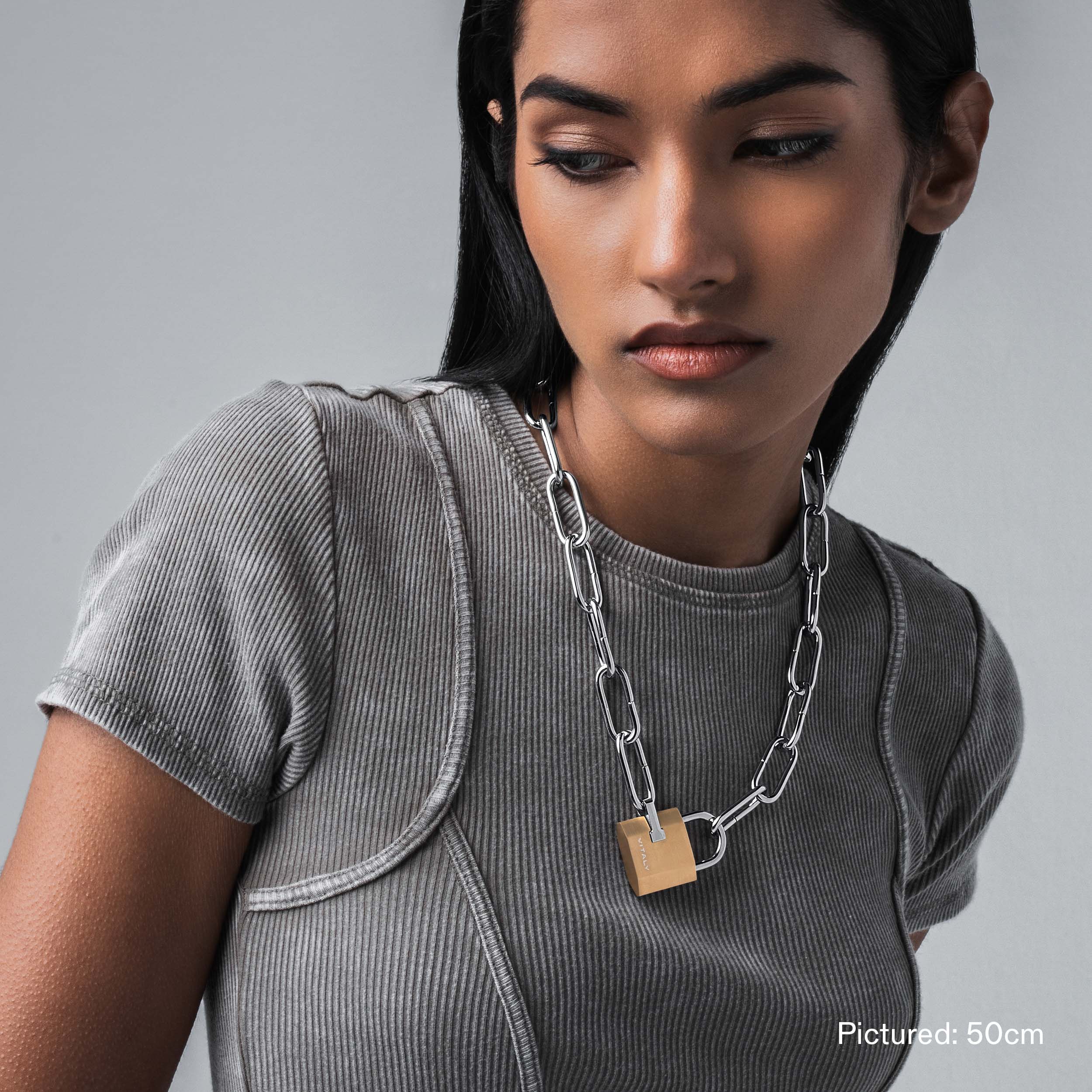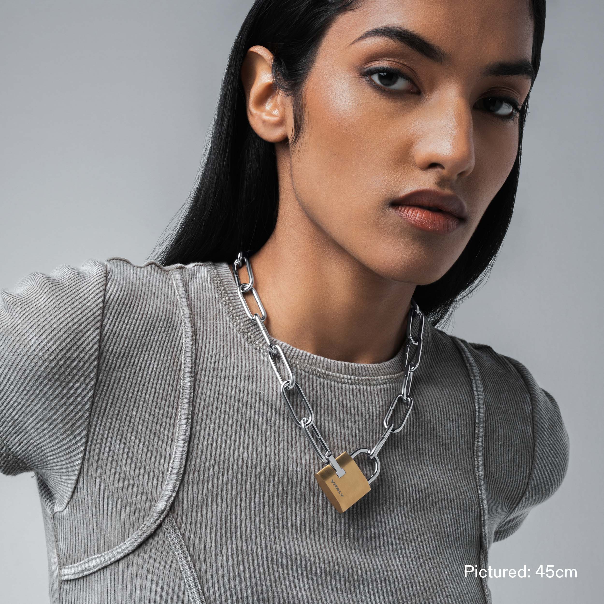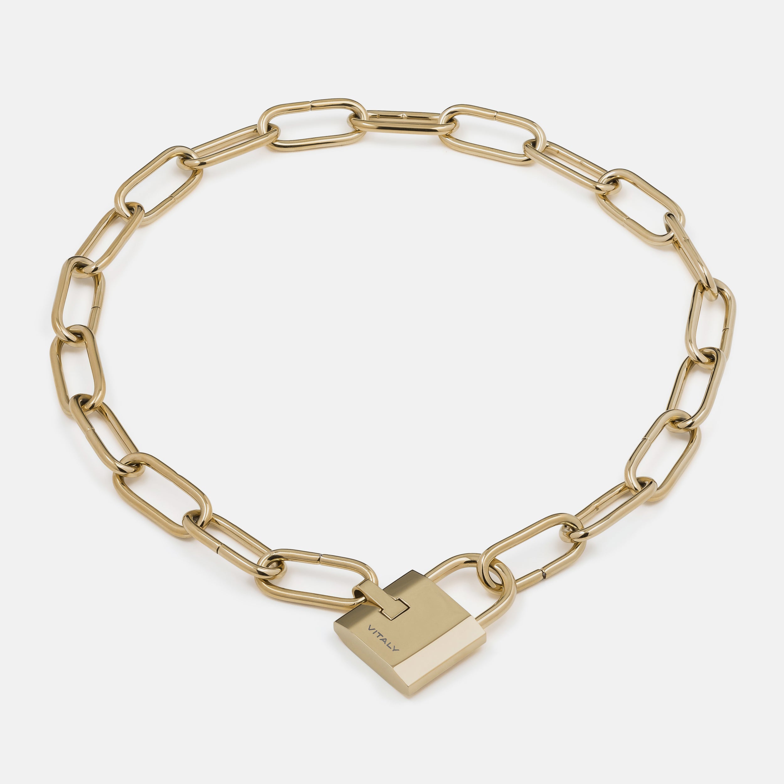 The Trespass features polished steel links with a custom brushed-gold padlock. The unique magnetic clasping mechanism causes the lock to hang asymmetrically. putting a new spin on a well-worn design.