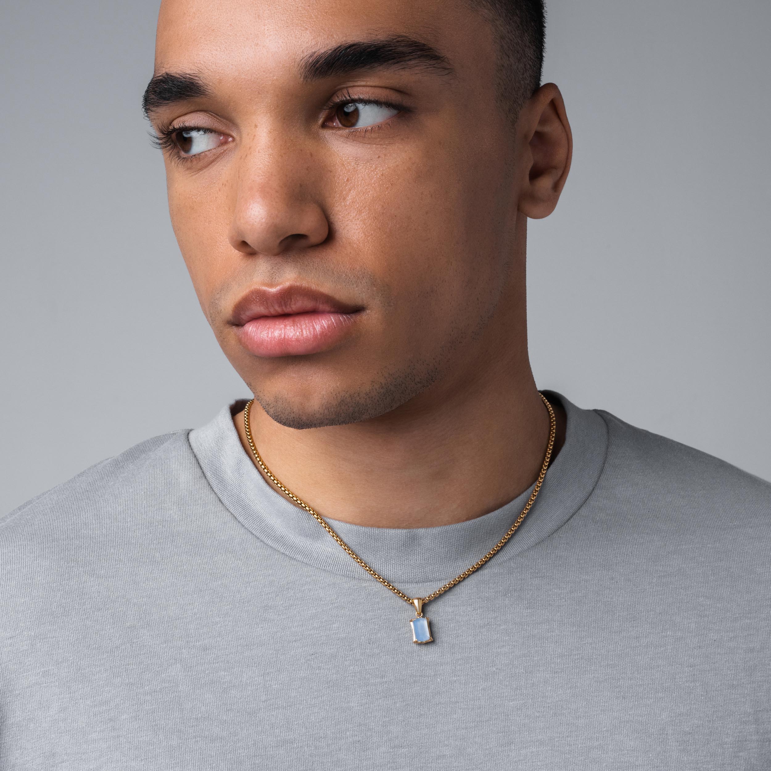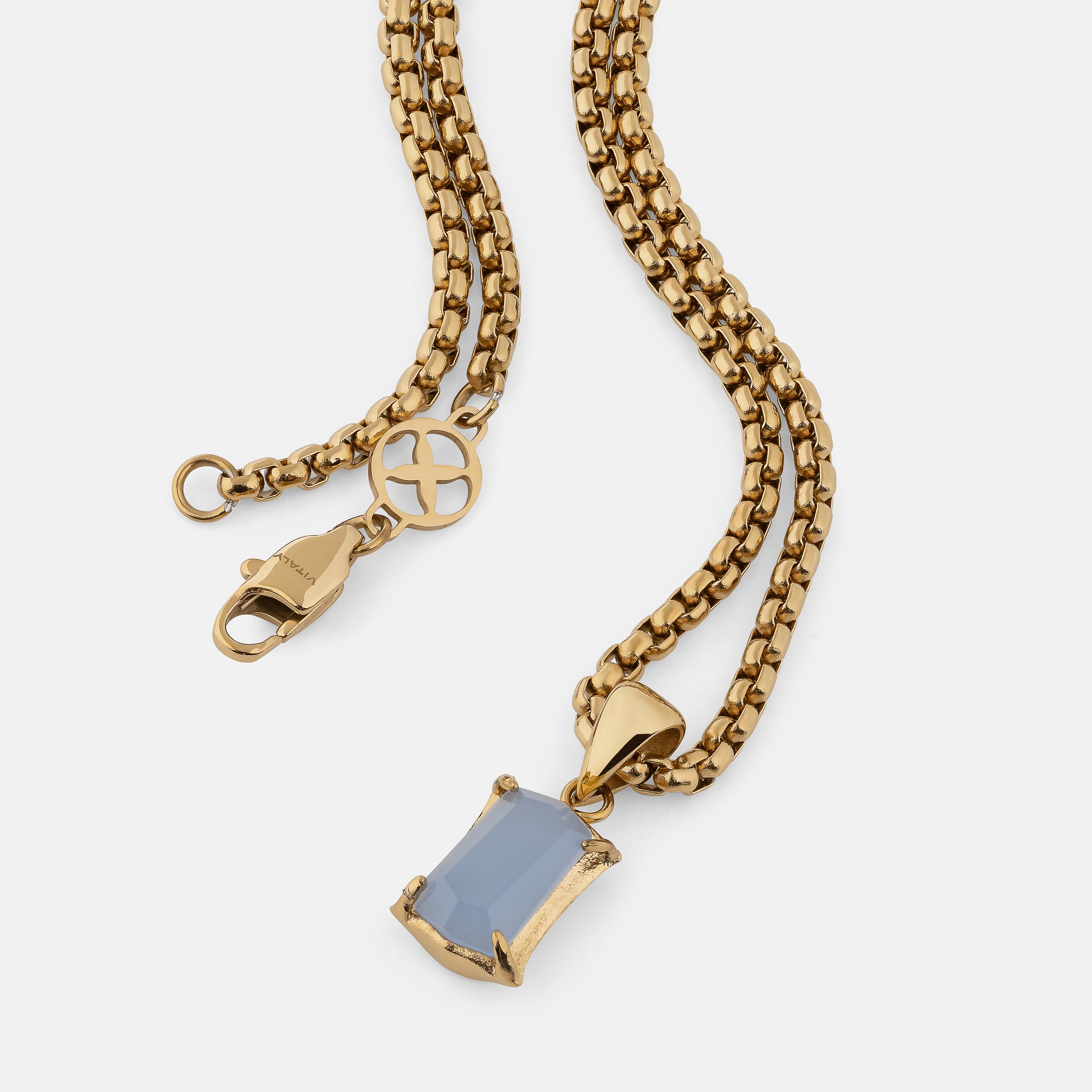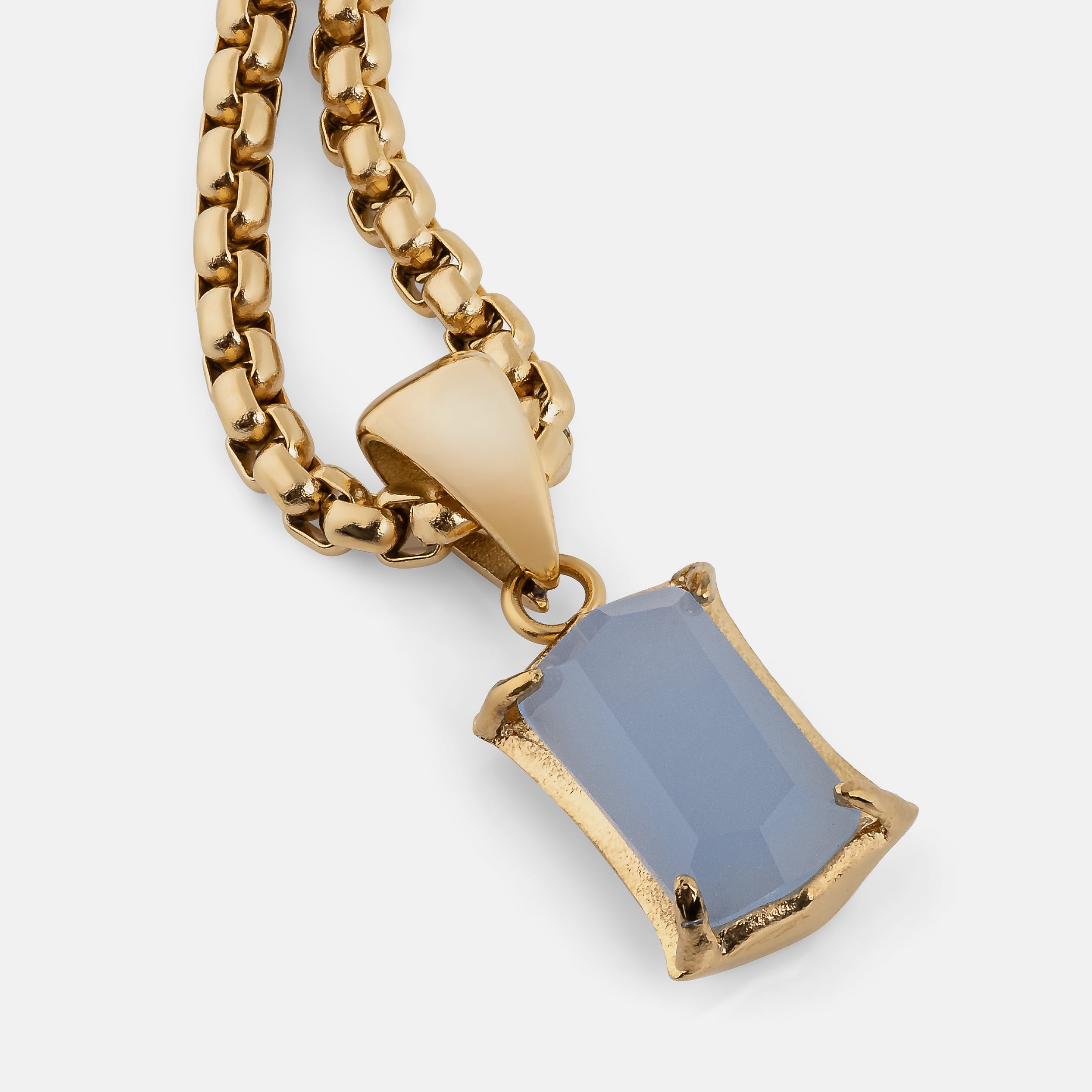 The Tryst is a diminutive pendant that combines an air of elegance with industrial components. Reimagining crystal jewelry for a new age. it features a pale blue glass crystal enclosed in a sharp-edged casing that hangs on a rounded box chain.