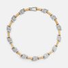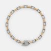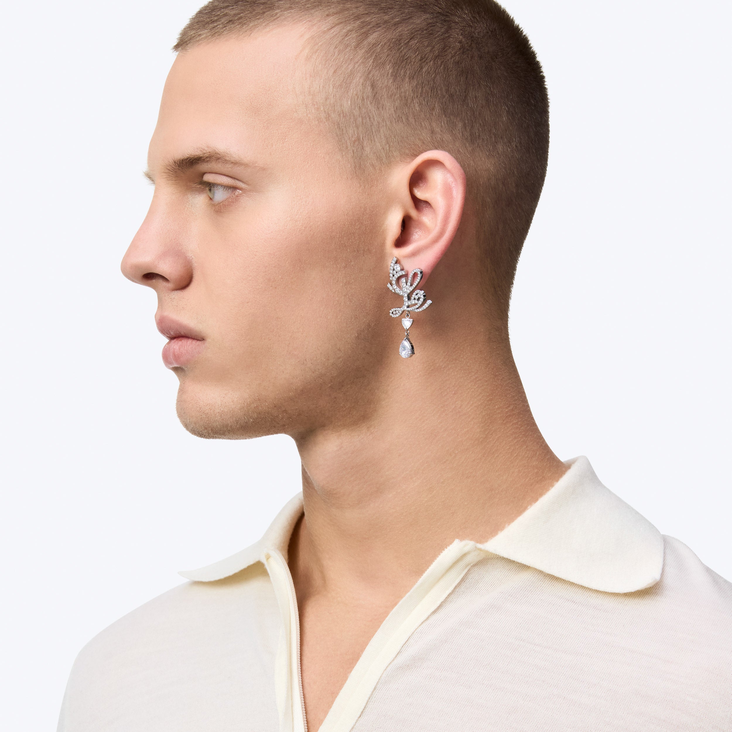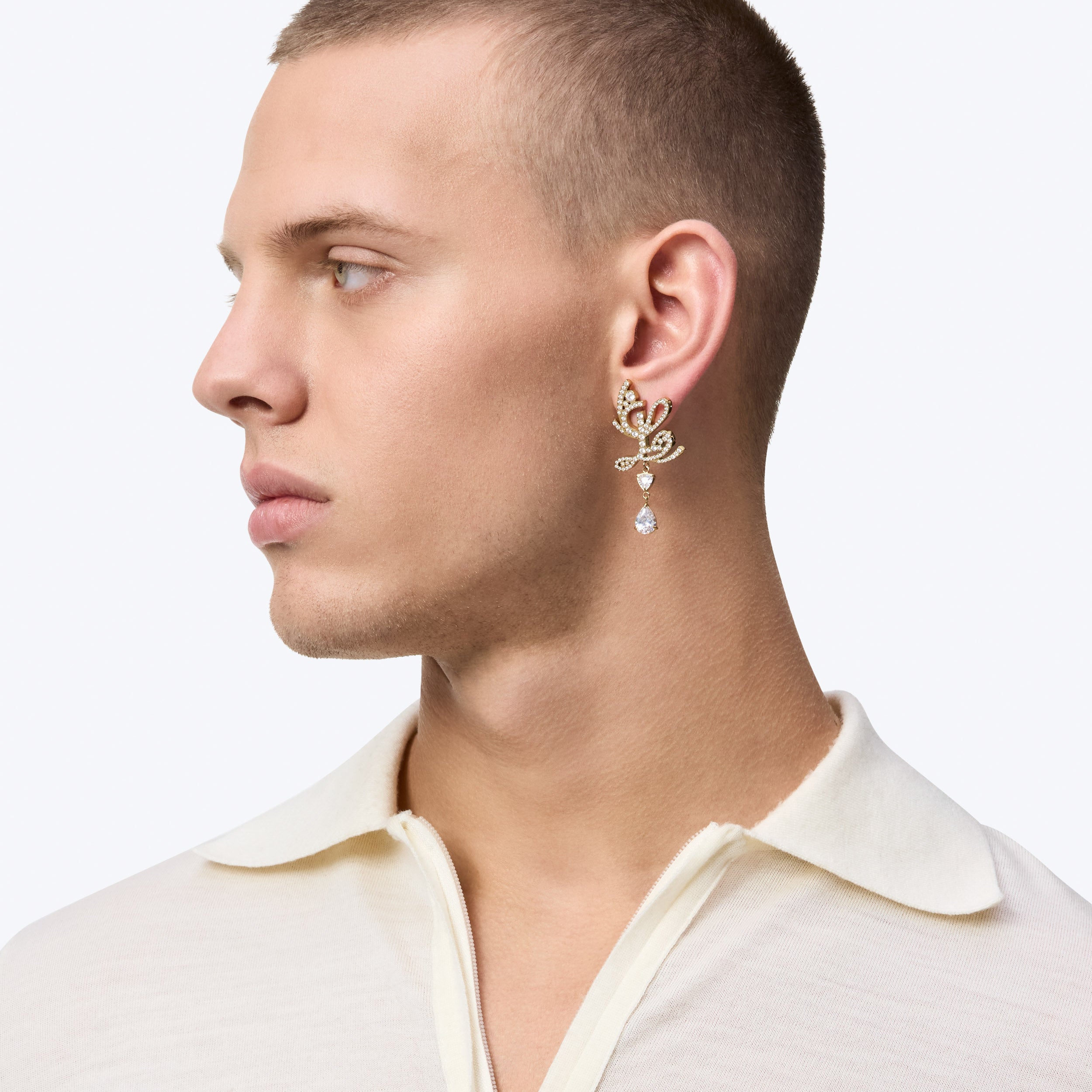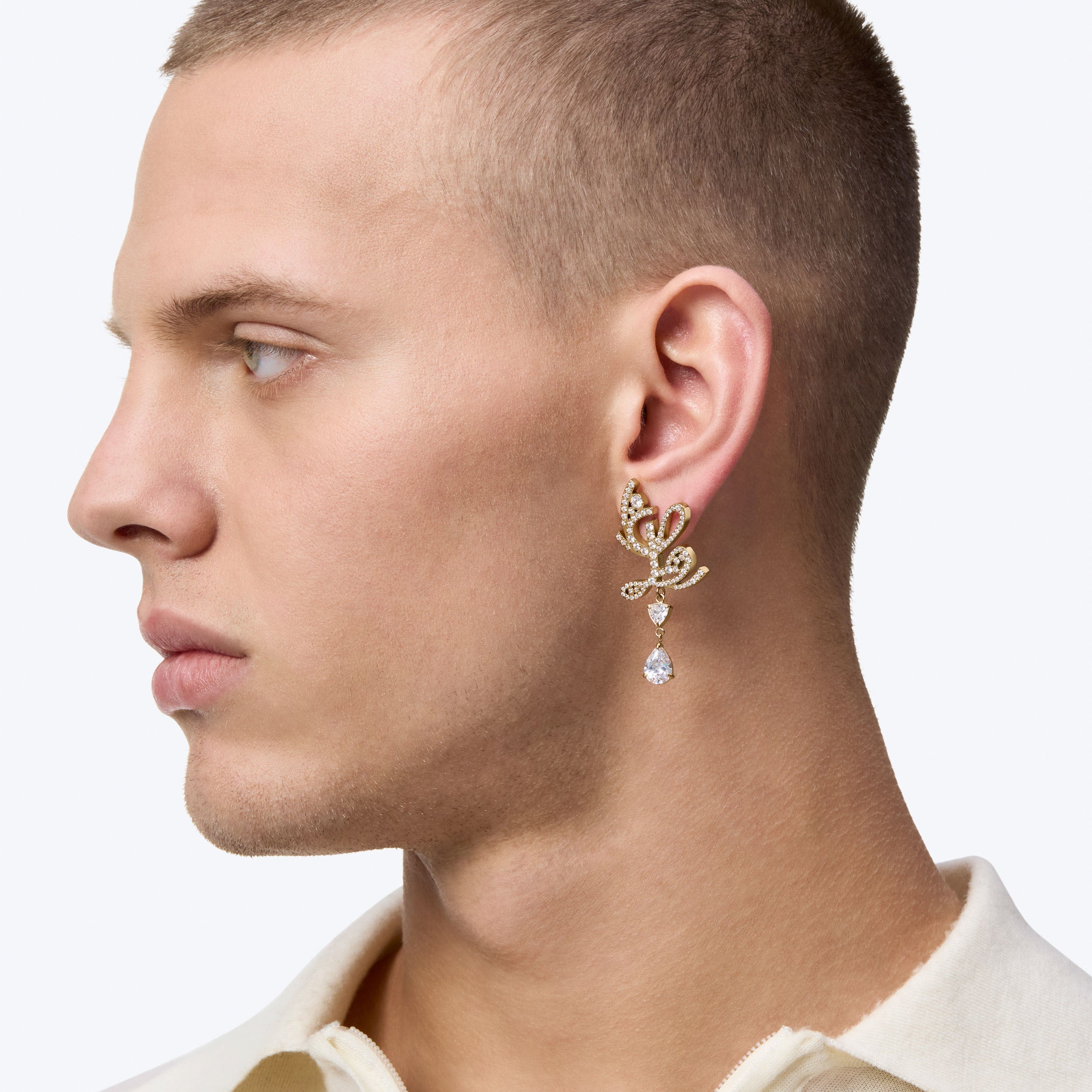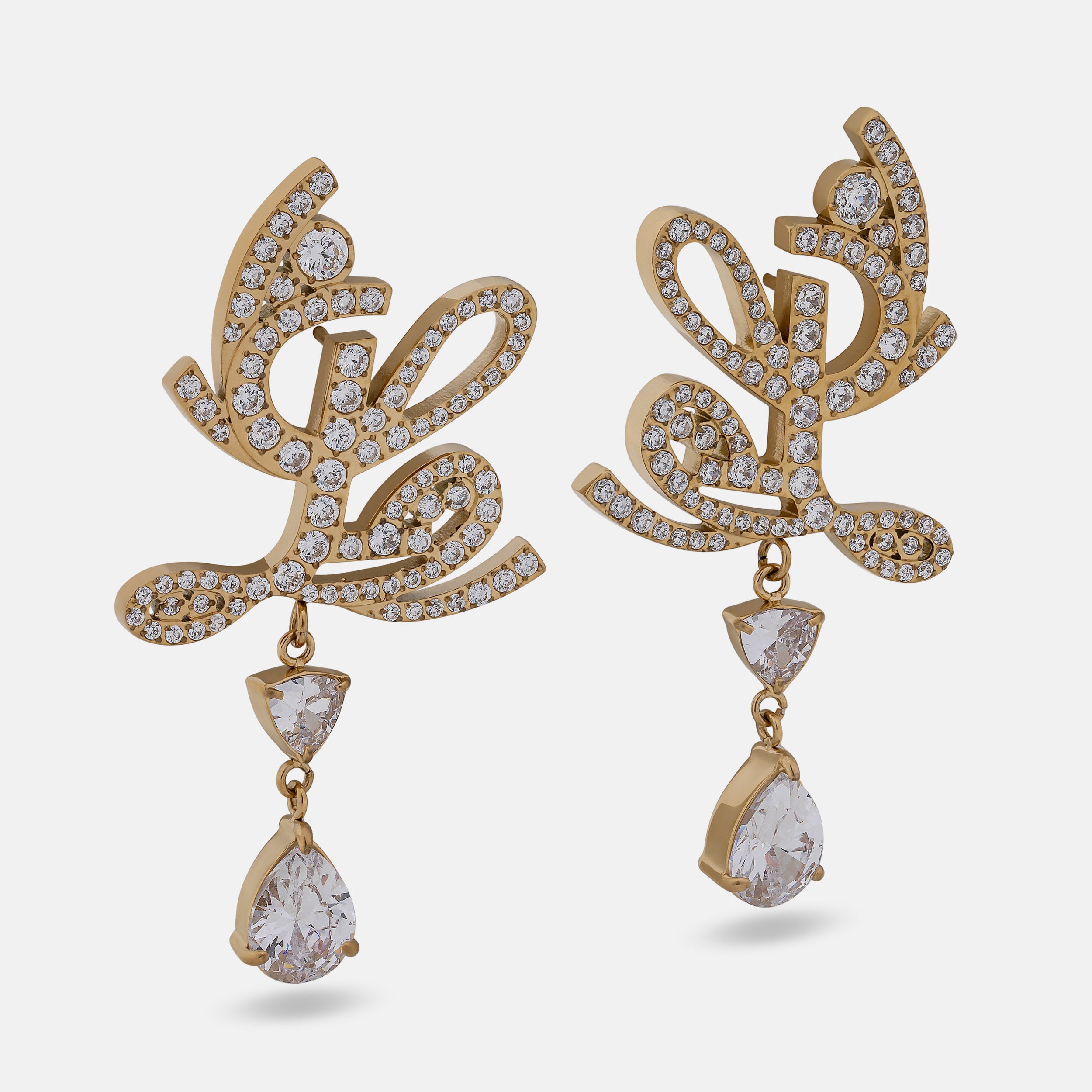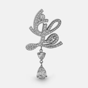 The monogram is fully encrusted with precision-set crystals. Suspended below is a cascading arrangement of a triangular and pear-cut crystal. catching light in motion.