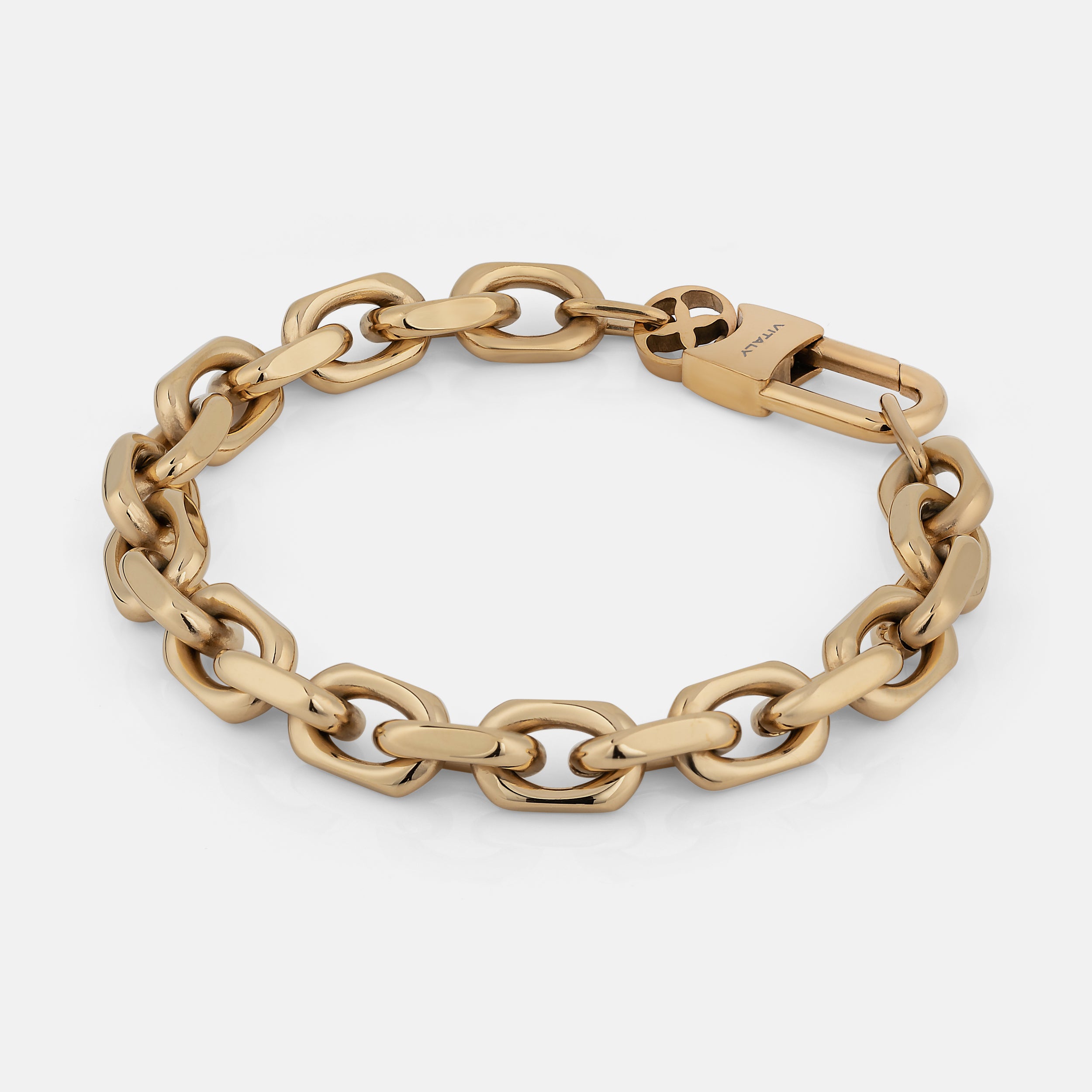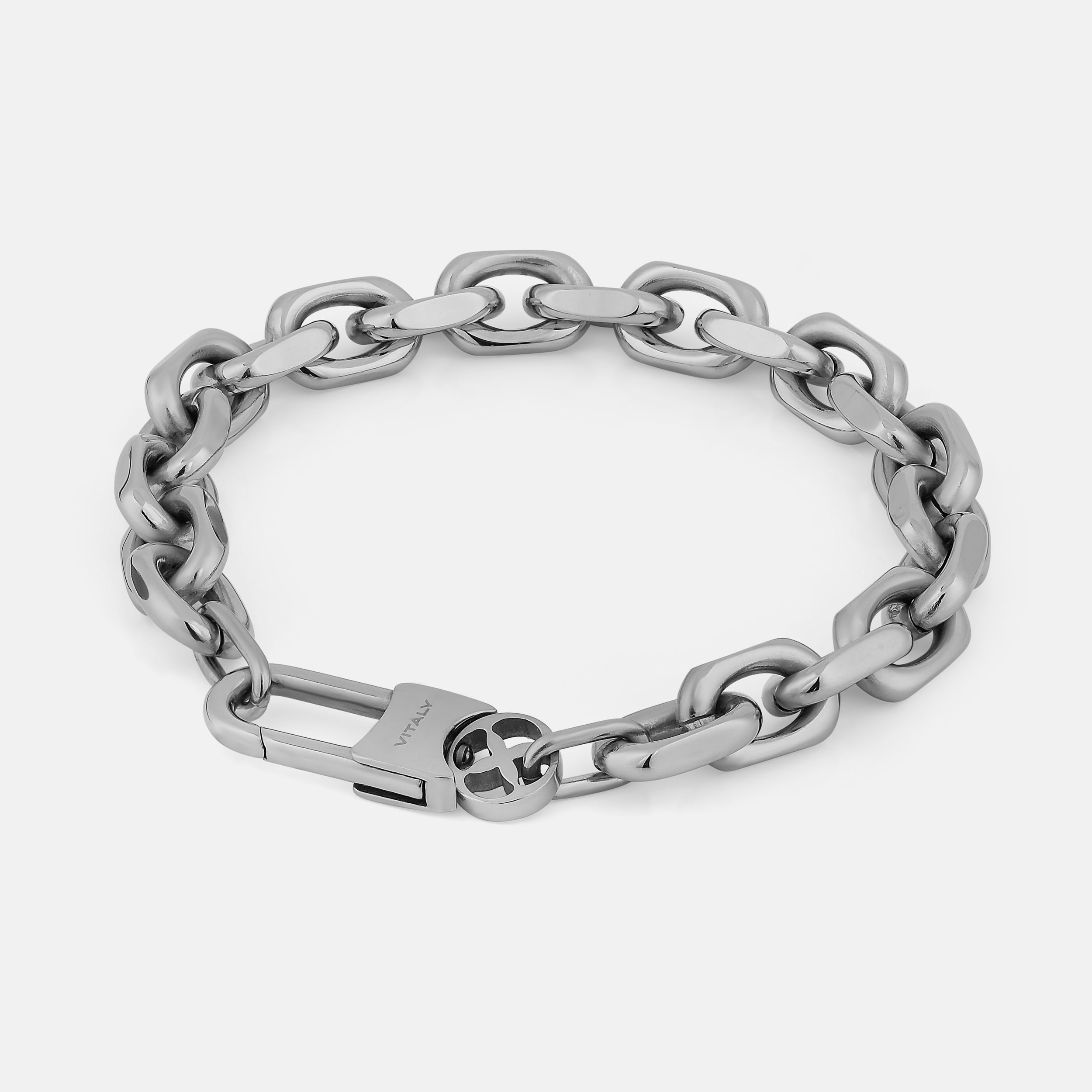 The Warrant is a mid-size bracelet constructed from squared-off cable links. resulting in an industrial effect with a high-polish edge.