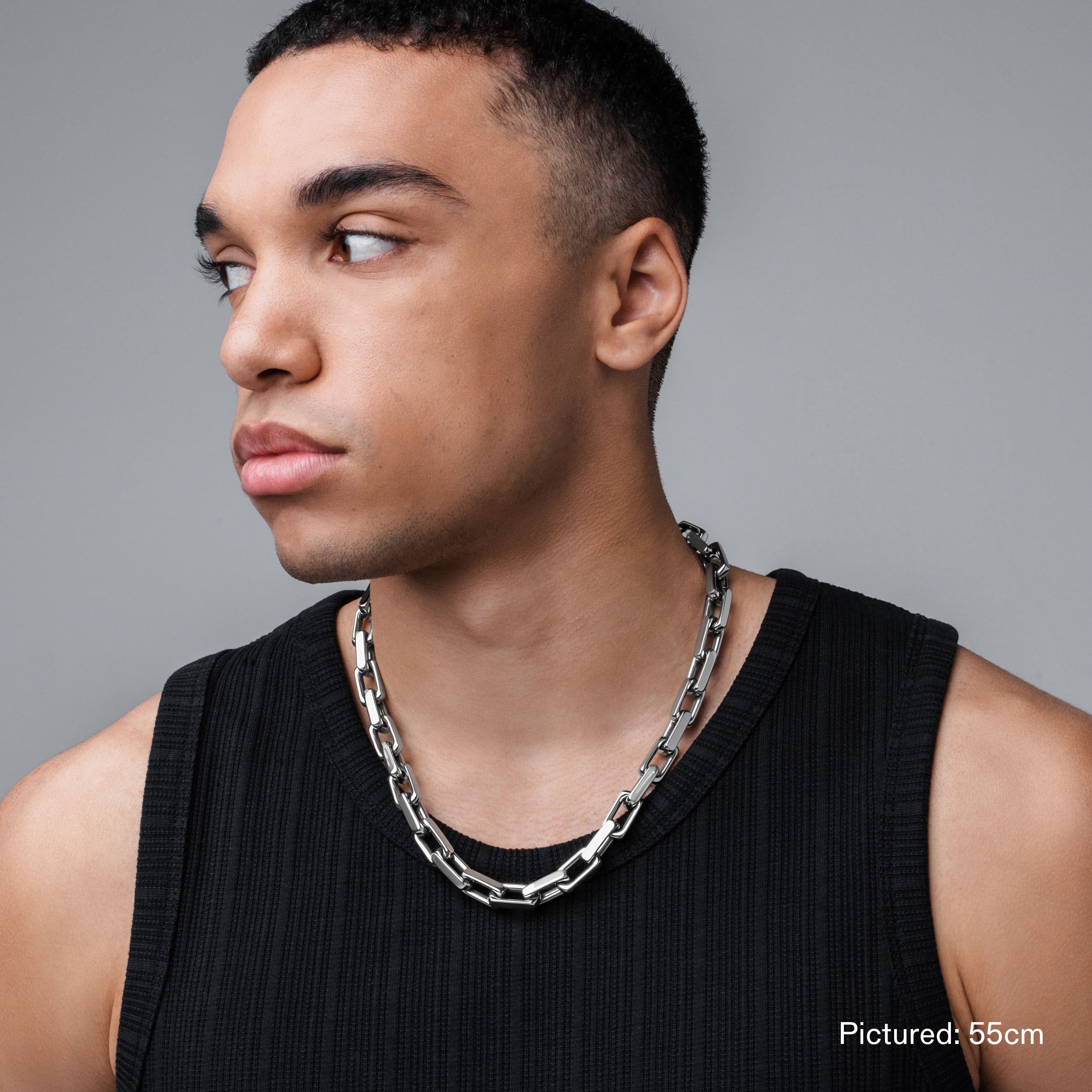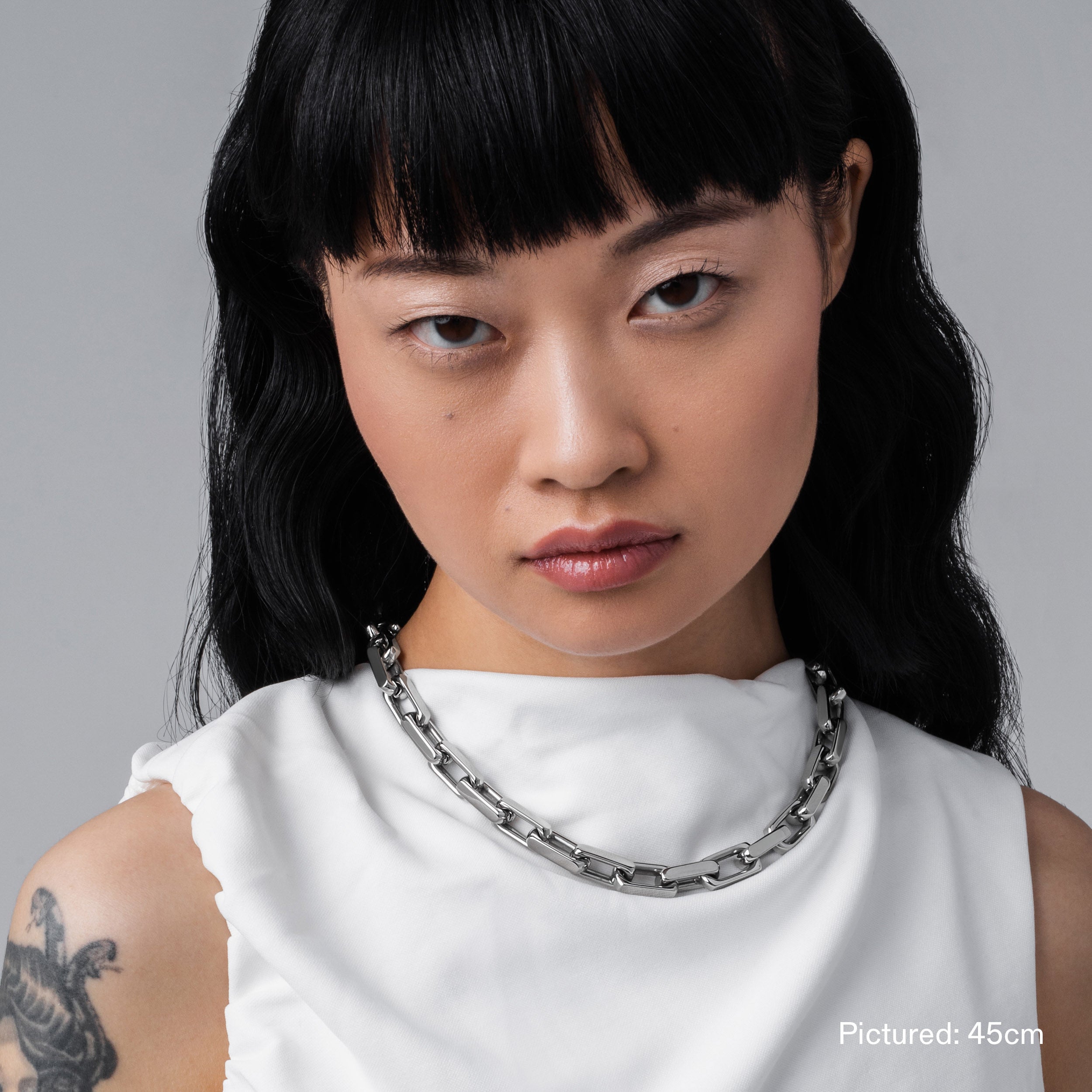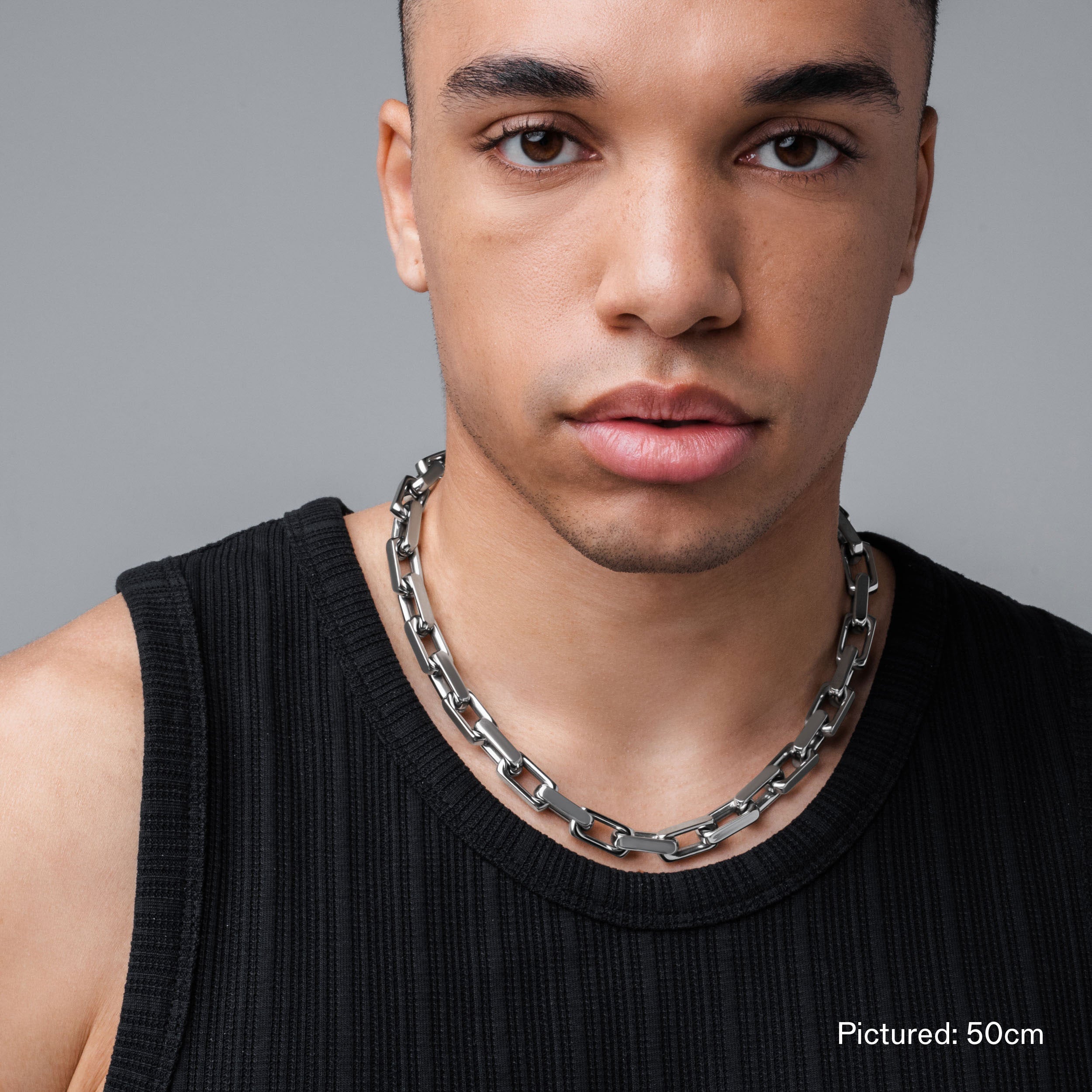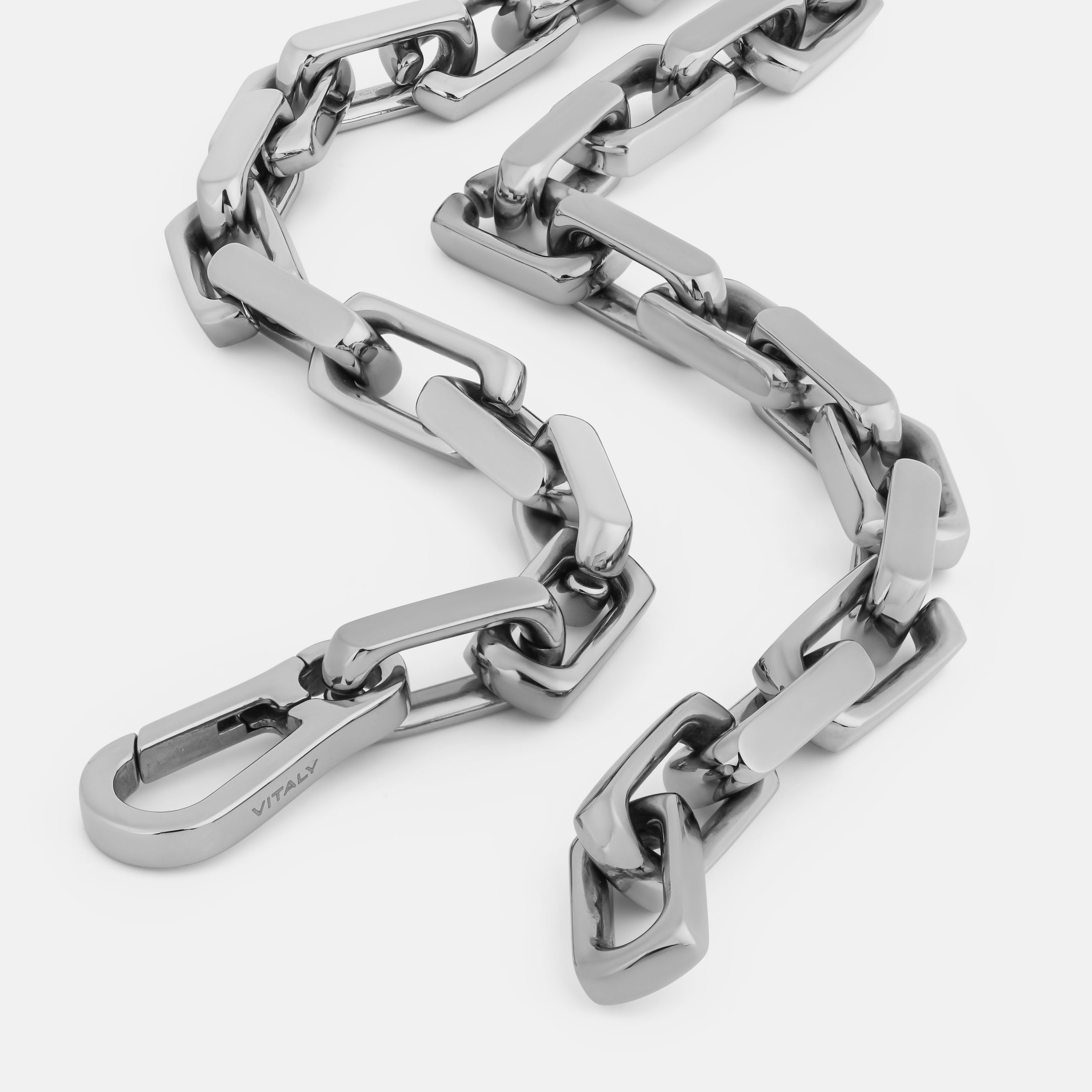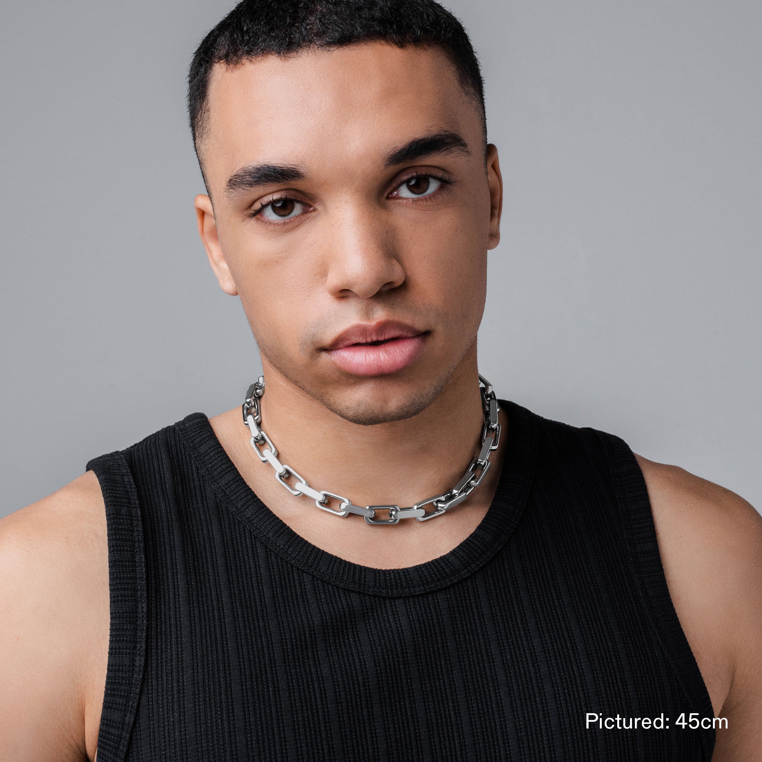 This bold. chunky choker chain features highly-polished squared-off links that snap shut with a low-profile carabiner.