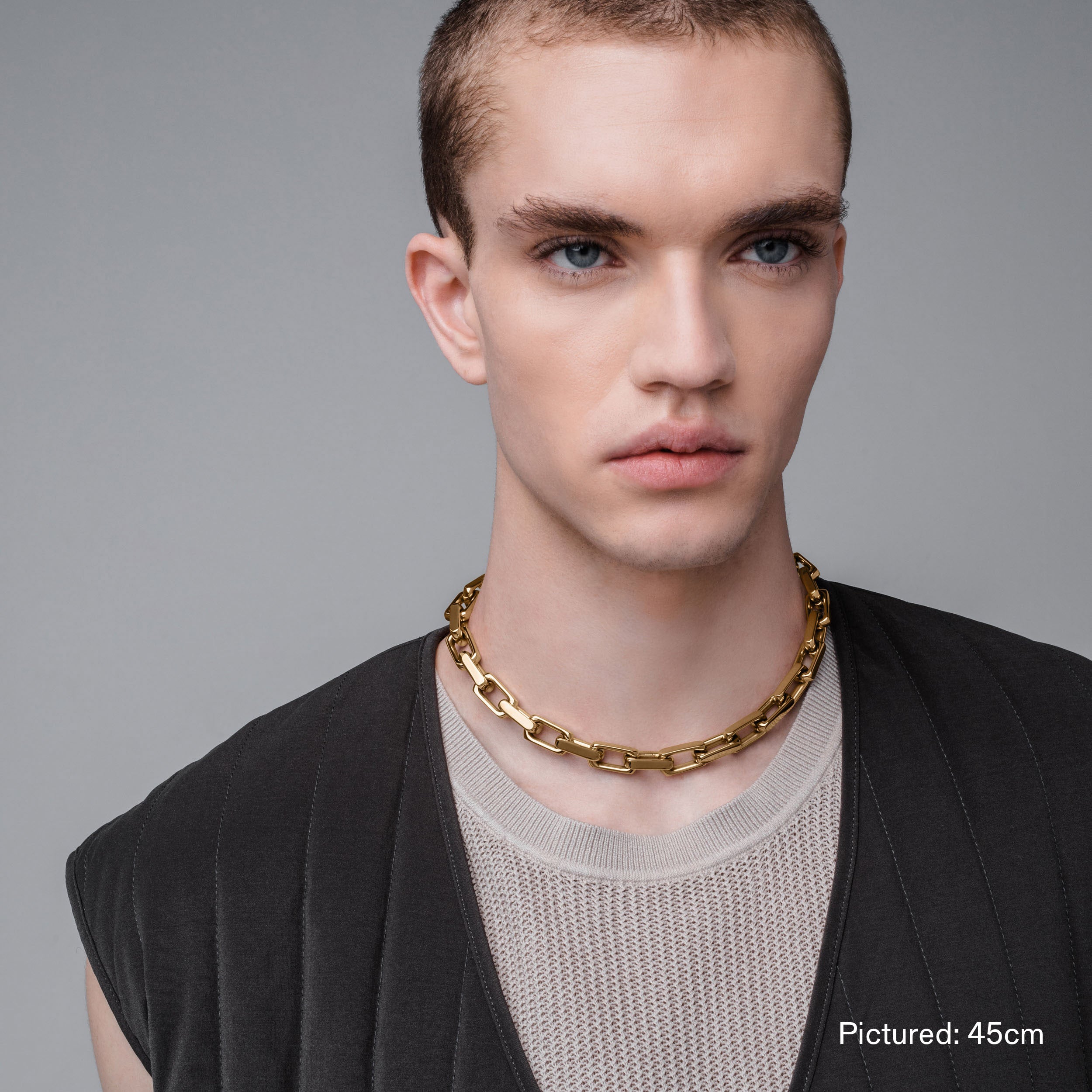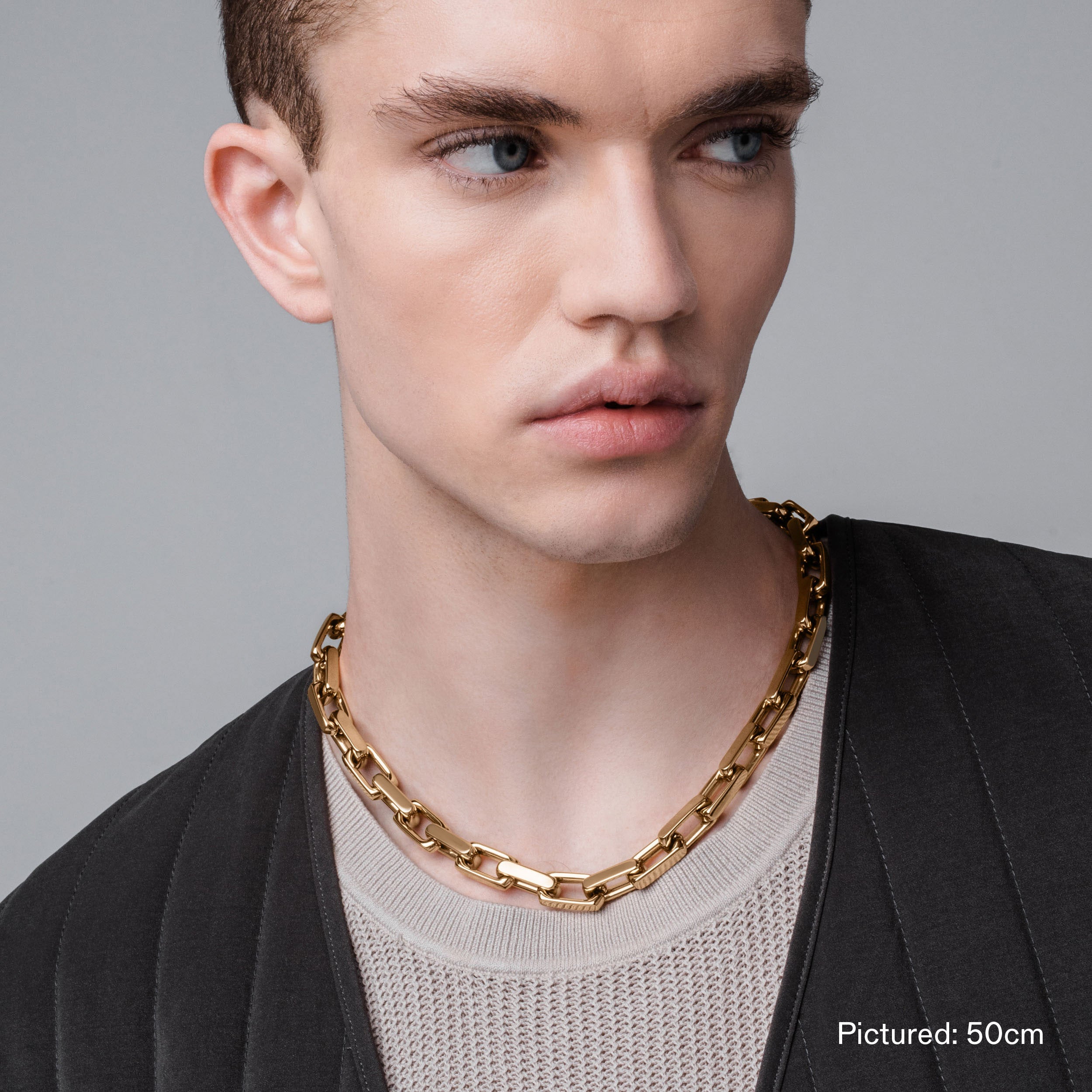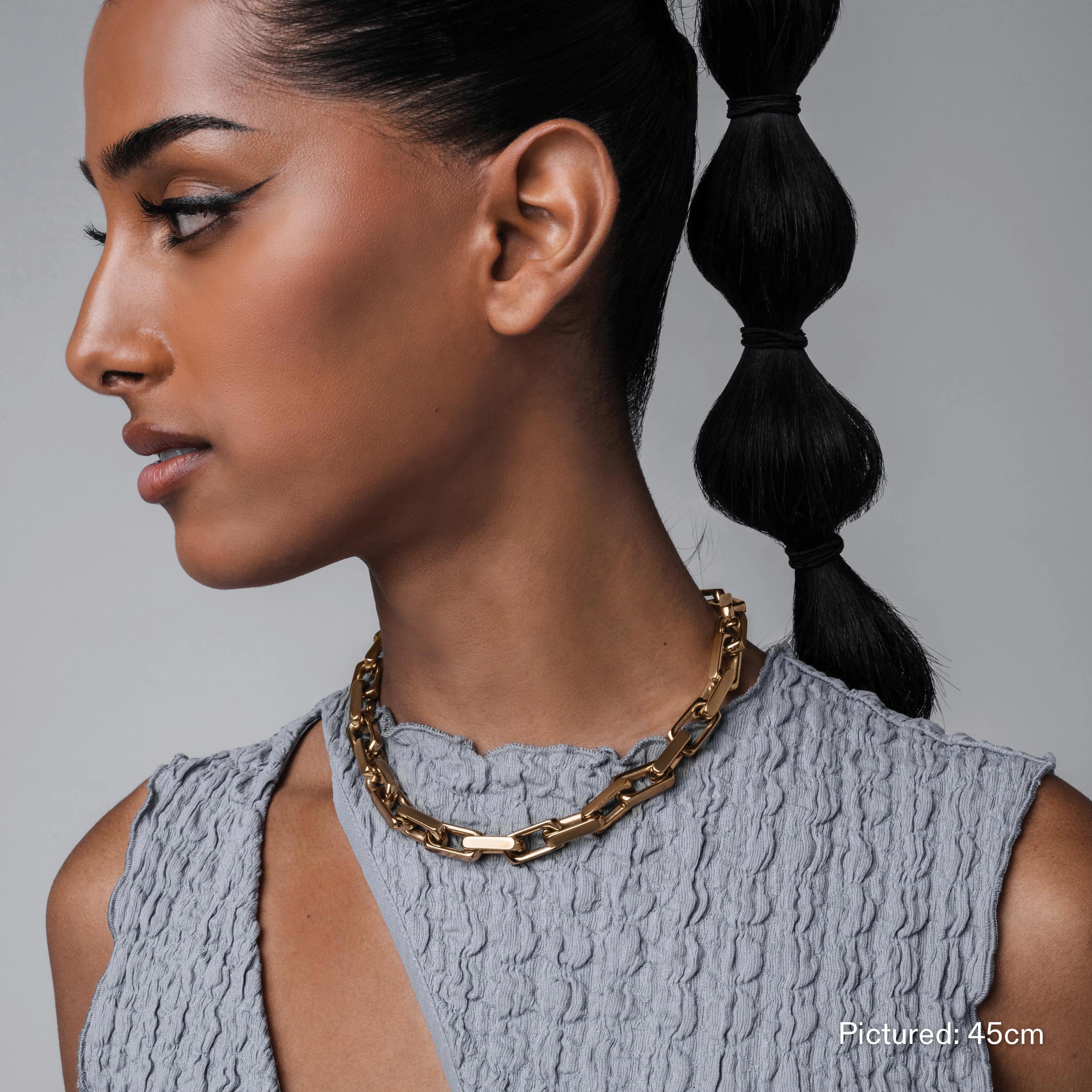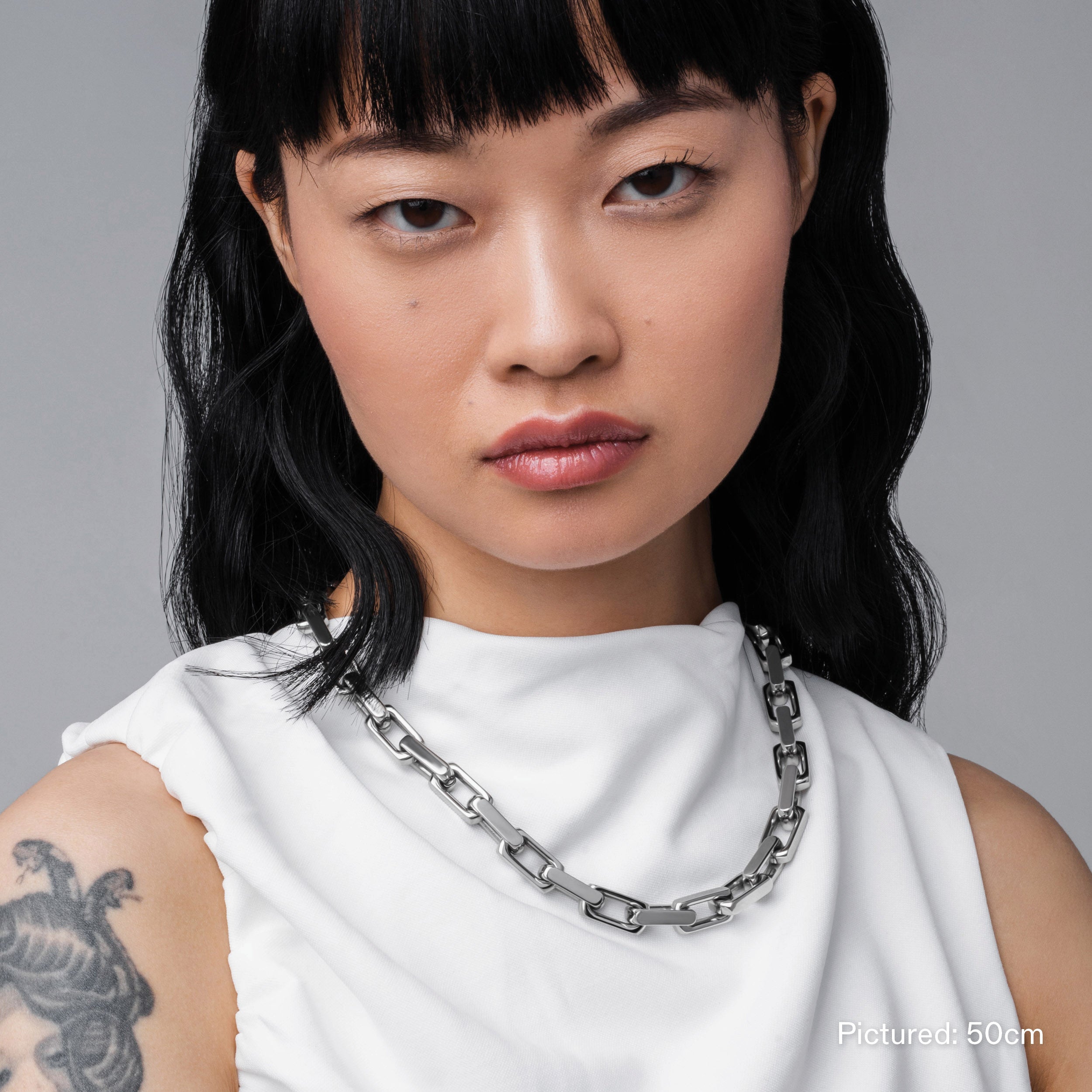 This bold. chunky choker chain features highly-polished squared-off links that snap shut with a low-profile carabiner.