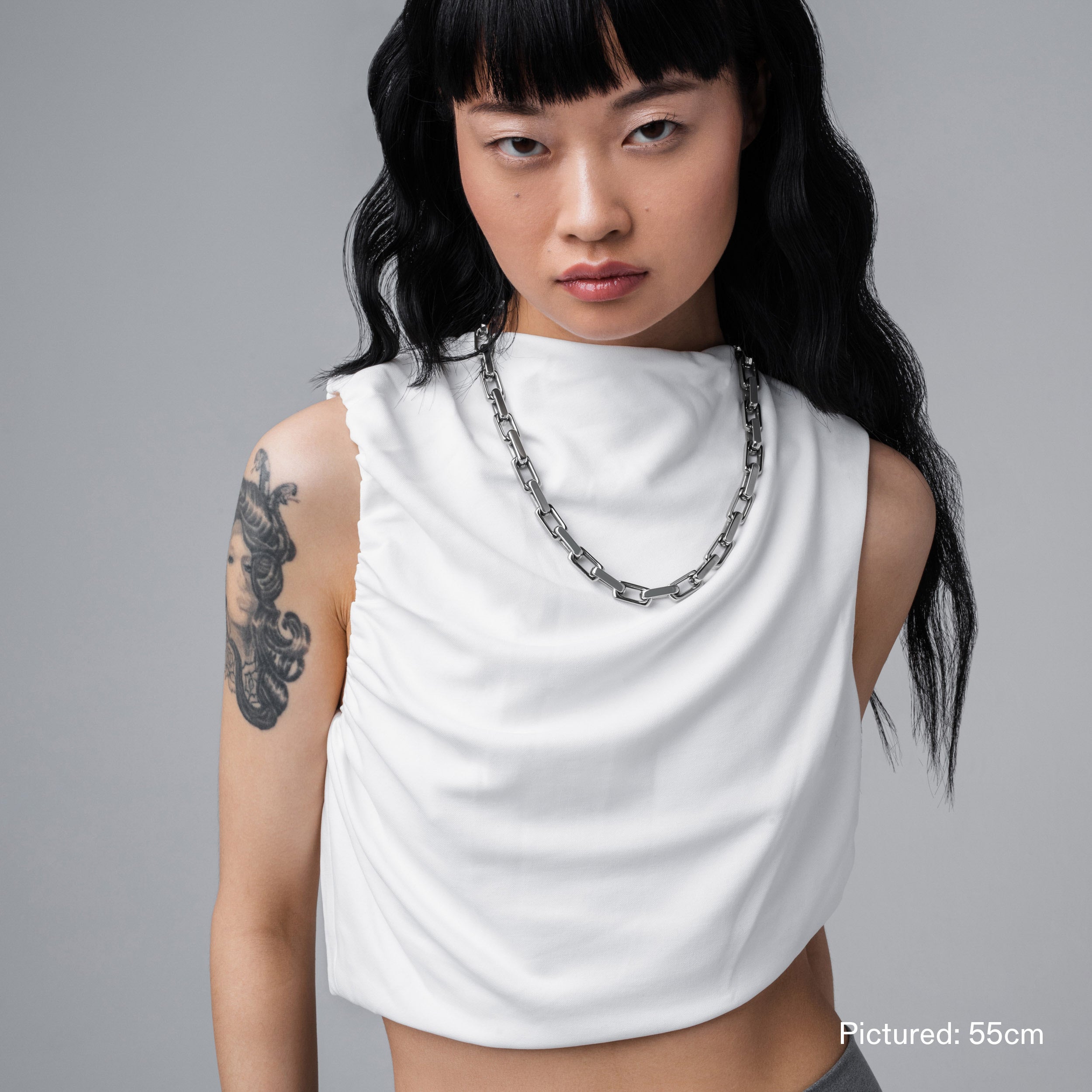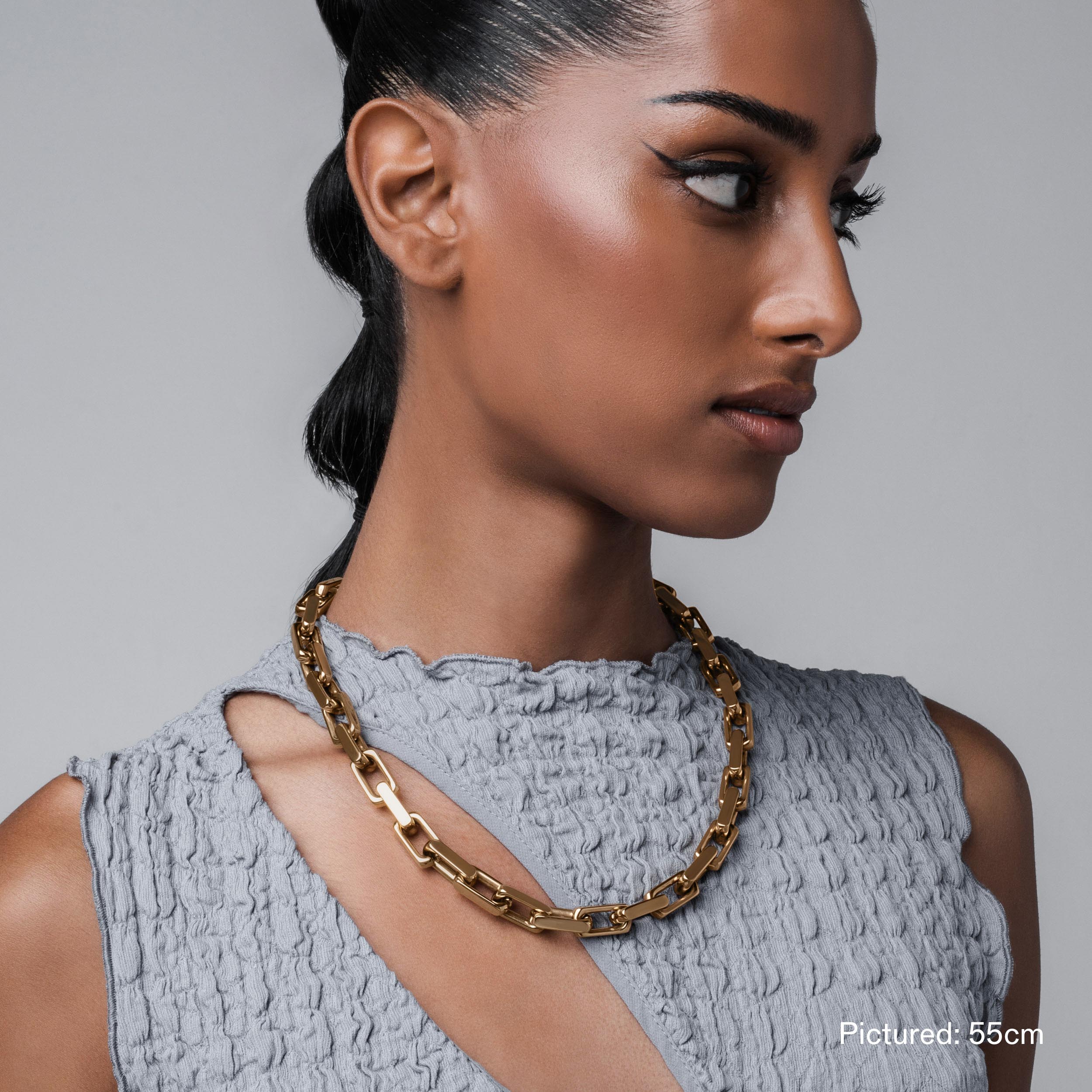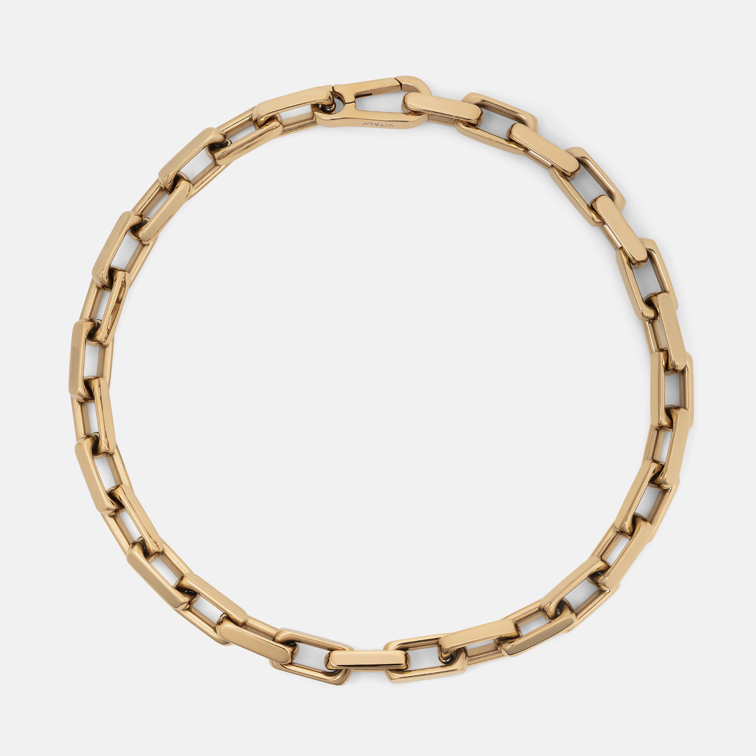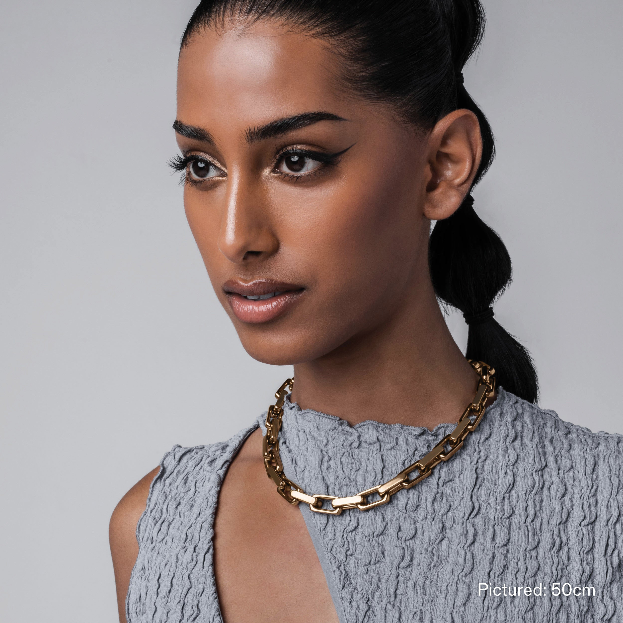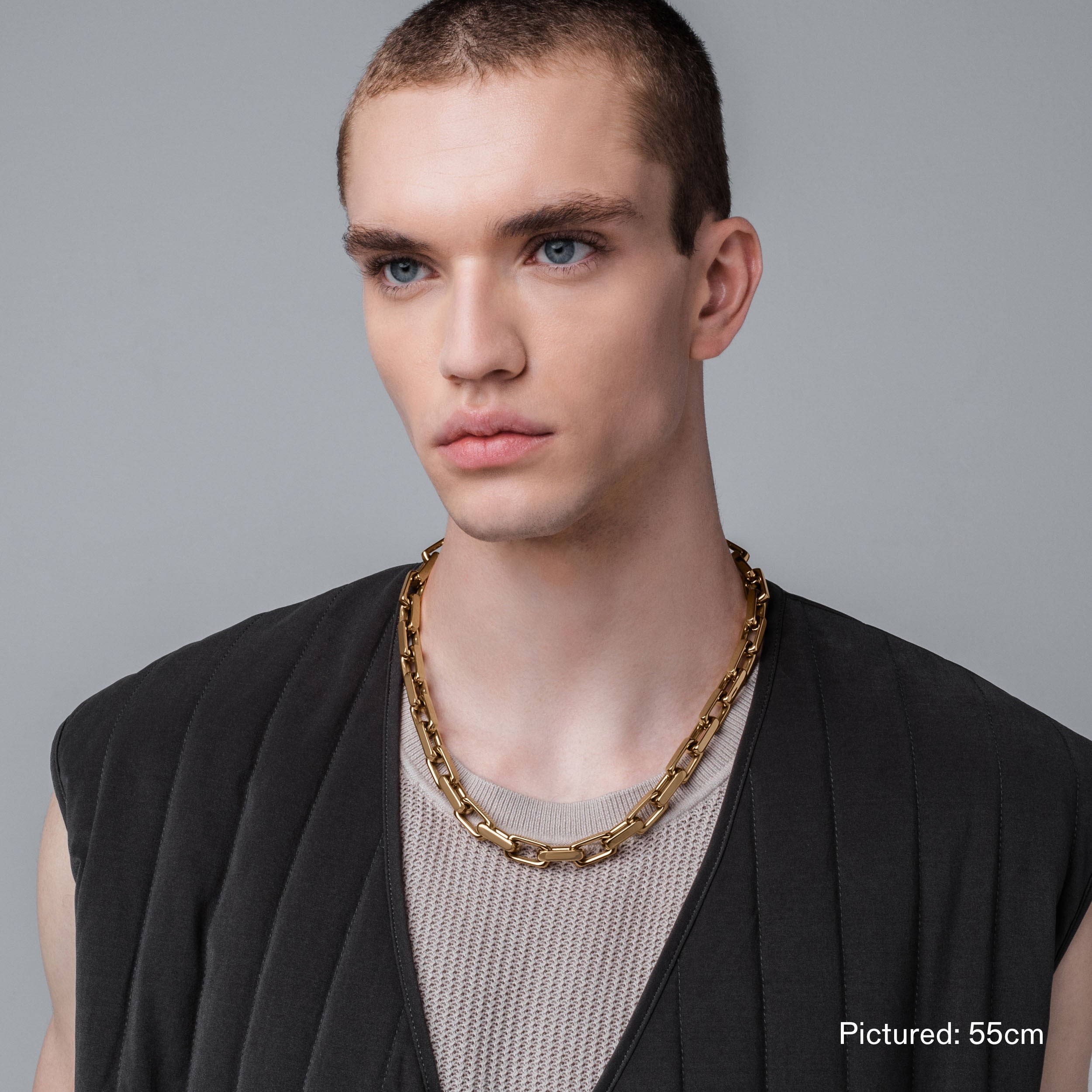 This bold. chunky choker chain features highly-polished squared-off links that snap shut with a low-profile carabiner.